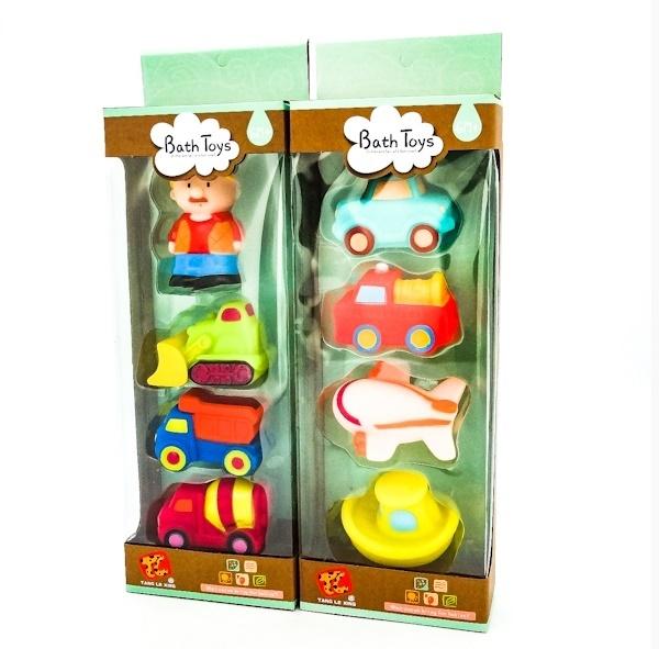 Zestaw gumowych zabawek do kąpieli w kształcie pojazdów.
