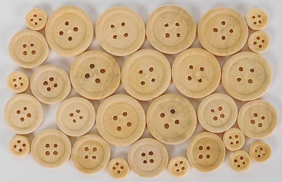 Drewniane guziki ozdobne, mix rozmiarów - 10 x 1 cm, 10 x 1,5 cm, 10 x 2 cm, w opakowaniu 30 szt.