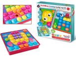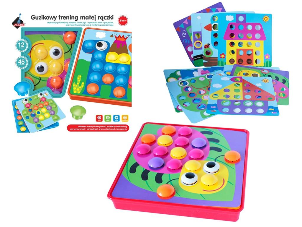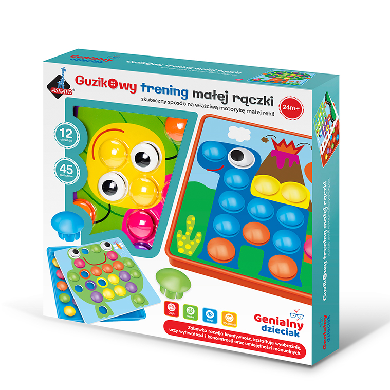Ta wspaniała zabawka nauczy twoje dziecko, kształtów i kolorów. Guzikowy Trening rozwija wyobraźnię, oraz myślenie przestrzenne, które jest tak ważne w rozwoju każdego dziecka.Układanka guziczki to zabawka rozwijająca kreatywność małych dzieci, kształtująca wyobraźnię, ucząca wytrwałości i koncentracji oraz umiejętności manualnych.Układanka stymuluje motorykę małej ręki - sprawność dłoni i paluszków. Zestaw zawiera wygodne pudełko do przechowywania, aż 45 kolorowych guzików i 12 różnych wymiennych plansz do umieszczenia na specjalnym pudełku z dziurkami, na których układamy guziczki.Żywe kolory oraz różnorodność obrazków zachęca dziecko do zabawy i uczy nazywania i rozpoznawania kolorów.