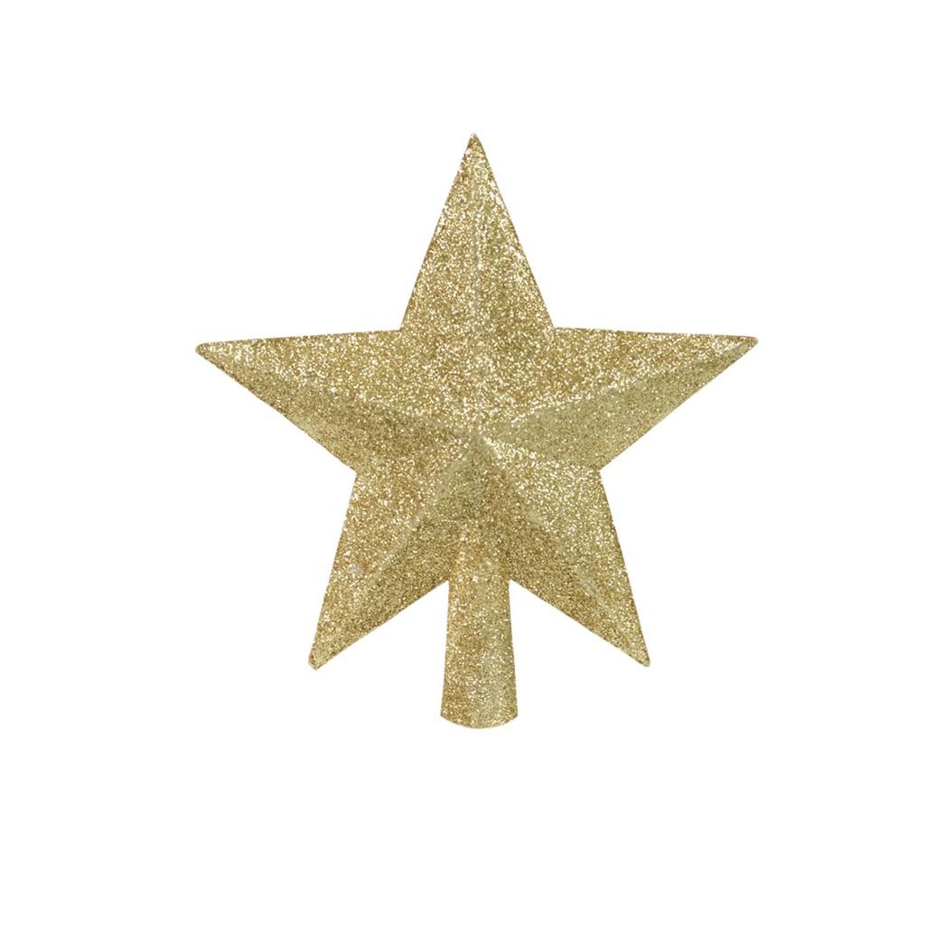 Szpic dekoracyjny na choinkę w kształcie gwiazdy w kolorze złotym. Błyszcząca gwiazda pokryta drobnym brokatem. Pięknie mieni się pośród blasku choinkowych lampek. Uniwersalna dekoracja choinki pasująca do innych ozdób. Dopełnia finalną dekorację świątecznego drzewka. Gwiazda o wymiarze 14x13 cm. Produkt wykonany z wytrzymałego tworzywa sztucznego.