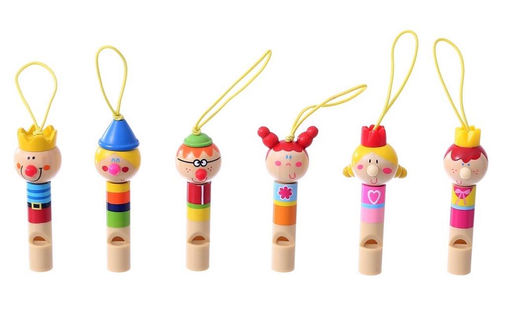 Kolorowe drewniane gwizdki to zabawka dla początkujących muzyków. Dziecko może próbować wygrywać piersze dźwięki.