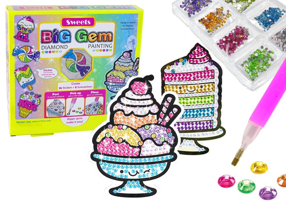 Haft Diamentowy Zestaw Kreatywny Naklejki Wyklejanie Diamentów Słodycze Haft diamentowy to najmodniejsza kreatywna zabawa dla dzieci. Dobranie odpowiednich diamencików pobudza wyobraźnie i zmysł artystyczny, to niezwykle wciągająca czynność, własnoręcznie stworzone szablony i naklejki ozdobią pokój małej dziewczynki lub plecak, będą błyszczeć z daleka. To niezwykle wciągające zajęcie, które ćwiczy koordynacje ręka- oko i uczy cierpliwości. Zestaw przedstawia apetyczne słodycze. Jak rozpocząć zabawę? 1. Przygotowanie miejsce do zabawy. Do pojemnika rozdzielamy kolorowe diamenciki do poszczególnych przegródek na tacy. 2. Zdejmujemy foliową warstwę ochronną z szablonu bezpośrednio przed rozpoczęciem, na warstwę klejącą umożliwi przyklejenie diamencików. Dzięki temu reszta warstwy klejącej nie wyschnie. 3. Końcówkę aplikatora wbijamy w wosk, a potem na diamencik, będzie przyklejał się do jego końcówki i w ten sposób łatwo i precyzyjnie umieścimy element w wybranym miejscu. 4. Jeżeli diamencik został źle wklejony, dopóki warstwa klejąca nie wyschnie, diamenciki można usuwać i przyklejać ponownie w tym samym miejscu. Elementy zestawu: - 2 szablony do postawienia - 12 naklejek - 7 woreczków z kolorowymi diamencikami - 2 przyssawki z haczykami - 2 plastikowe podstawki - plastikowa tacka do segregacji kolorów - wosk - aplikator do przyklejania diamentów Wymiary szablonu: 19 cm x 13 cm x 1 cm Wymiary opakowania: 26 cm x 24 cm x 5 cm Zgodna z normą EN71 i certyfikatem CE.