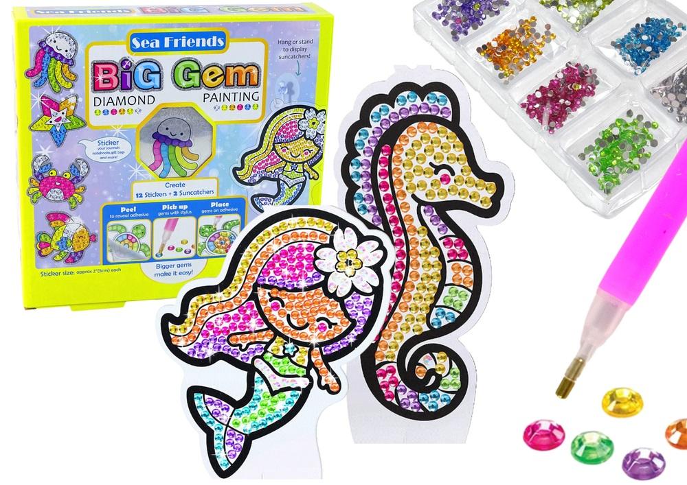 Haft Diamentowy Zestaw Kreatywny Naklejki Wyklejanie Diamentów Zwierzęta Morskie Haft diamentowy to najmodniejsza kreatywna zabawa dla dzieci. Dobranie odpowiednich diamencików pobudza wyobraźnie i zmysł artystyczny, to niezwykle wciągająca czynność, własnoręcznie stworzone szablony i naklejki ozdobią pokój małej dziewczynki lub plecak, będą błyszczeć z daleka. To niezwykle wciągające zajęcie, które ćwiczy koordynacje ręka- oko i uczy cierpliwości. Zestaw przedstawia apetyczne słodycze. Jak rozpocząć zabawę? 1. Przygotowanie miejsce do zabawy. Do pojemnika rozdzielamy kolorowe diamenciki do poszczególnych przegródek na tacy. 2. Zdejmujemy foliową warstwę ochronną z szablonu bezpośrednio przed rozpoczęciem, na warstwę klejącą umożliwi przyklejenie diamencików. Dzięki temu reszta warstwy klejącej nie wyschnie. 3. Końcówkę aplikatora wbijamy w wosk, a potem na diamencik, będzie przyklejał się do jego końcówki i w ten sposób łatwo i precyzyjnie umieścimy element w wybranym miejscu. 4. Jeżeli diamencik został źle wklejony, dopóki warstwa klejąca nie wyschnie, diamenciki można usuwać i przyklejać ponownie w tym samym miejscu. Elementy zestawu: - 2 szablony do postawienia - 12 naklejek - 7 woreczków z kolorowymi diamencikami - 2 przyssawki z haczykami - 2 plastikowe podstawki - plastikowa tacka do segregacji kolorów - wosk - aplikator do przyklejania diamentów Wymiary szablonu: 19 cm x 13 cm x 1 cm Wymiary opakowania: 26 cm x 24 cm x 5 cm Zgodna z normą EN71 i certyfikatem CE.
