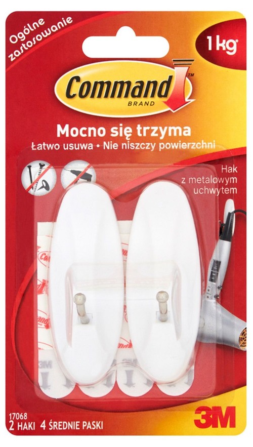 zapomnij o gwoździach, śrubokrętach czy wiertarkach z Command™ haczyki można łatwo i szybko zamontować do zastosowania ogólnego mocno się trzyma, łatwo usuwa nie niszczy powierzchni dopuszczalne obciążenie do 1 kg na 1 pasek w opakowaniu 2 haki i 4 średnie paski kolor: biały