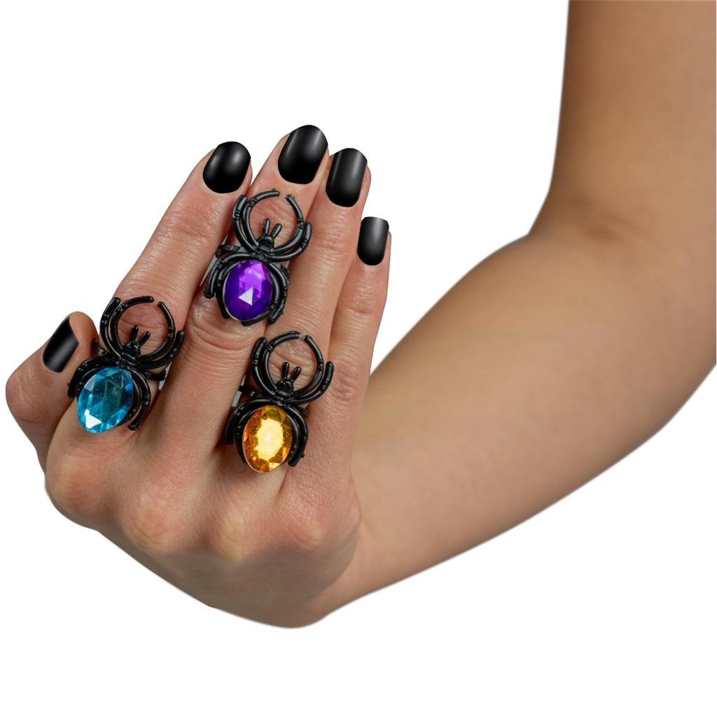 Pierścionki w kształcie pająków. Na pierścionkach znajduje się ozdoba imitująca mieniący się kryształ. Doskonałe jako uzupełnienie stylizacji z okazji halloween, balu przebierańców. W opakowaniu znajduje się mix kolorów. 4 sztuki w opakowaniu.