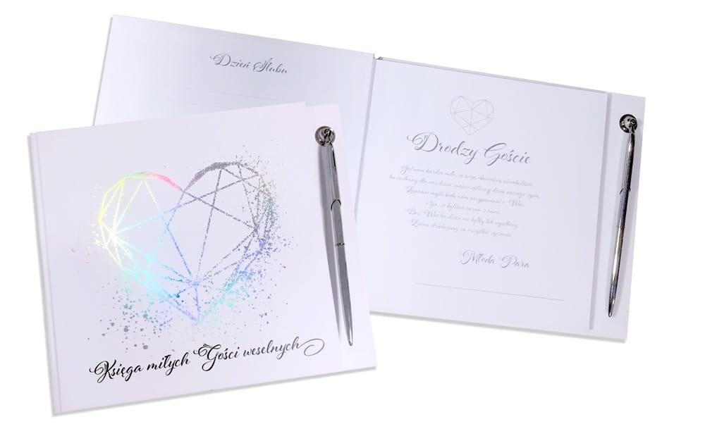 Księga gości Happy Book HBK-003 (kwadratowa). Dzień ślubu pozostaje na zawsze w pamięci Młodej Pary. Ten dzień pełen szczególnych emocji wymaga wyjątkowej oprawy. Aby upamiętnić ten jedyny w swoim rodzaju moment życia Kukartka stworzyła piękne Księgi gości. Happy Book to album, który pozwoli zachować wspomnienia z tego najważniejszego dnia. Wpisy gości, zapiski, wspomnienia i złote myśli przetrwają przez całe życie. Dołożyliśmy wszelkich starań, aby nasz produkt był trwały, elegancki i najwyższej jakości (jak to zwykle w Kukartce). 40 białych kart na wpisy poprzedzonych jest stroną tytułową oraz miejscem na zdjęcie. Ekskluzywna okładka zdobiona jest złotą lub srebrną folią (hot Stamp). Dla ułatwienia (i lepszego efektu) dołączamy elegancki długopis doskonale uzupełniający całość. Wymiar 265mm x 230mm. Całość jest zapakowana w eleganckie i trwałe pudełeczko. To produkt z najwyższej półki godny tego wyjątkowego dnia.