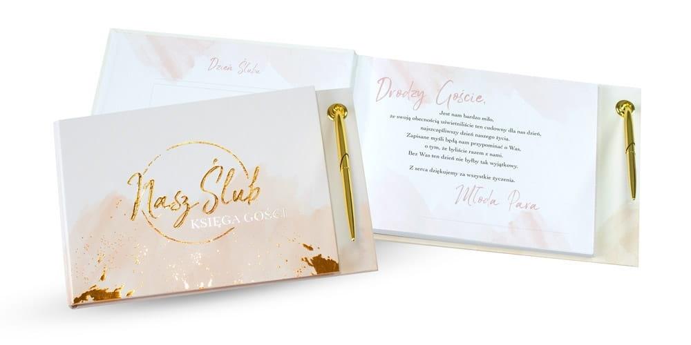 Księga gości Happy Book HBP-001 (prostokątna). Dzień ślubu pozostaje na zawsze w pamięci Młodej Pary. Ten dzień pełen szczególnych emocji wymaga wyjątkowej oprawy. Aby upamiętnić ten jedyny w swoim rodzaju moment życia Kukartka stworzyła piękne Księgi gości. Happy Book to album, który pozwoli zachować wspomnienia z tego najważniejszego dnia. Wpisy gości, zapiski, wspomnienia i złote myśli przetrwają przez całe życie. Dołożyliśmy wszelkich starań, aby nasz produkt był trwały, elegancki i najwyższej jakości (jak to zwykle w Kukartce). 40 białych kart na wpisy poprzedzonych jest stroną tytułową oraz miejscem na zdjęcie. Ekskluzywna okładka zdobiona jest złotą lub srebrną folią (hot Stamp). Dla ułatwienia (i lepszego efektu) dołączamy elegancki długopis doskonale uzupełniający całość. Wymiar 265mm x 170mm. Całość jest zapakowana w eleganckie i trwałe pudełeczko. To produkt z najwyższej półki godny tego wyjątkowego dnia.