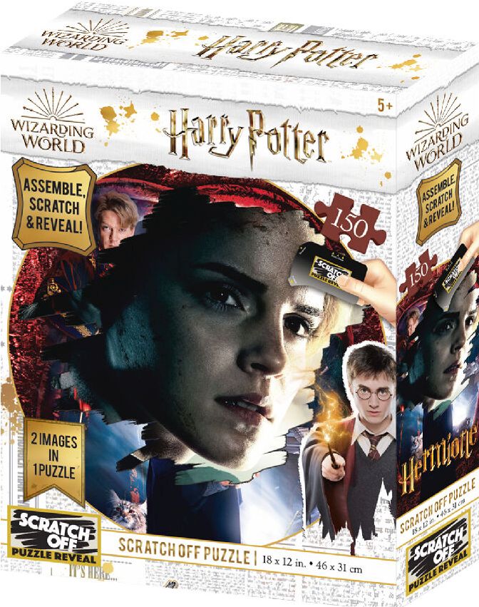 Harry Potter: Magiczne puzzle-zdrapka - Hermiona to niesamowita gratka dla prawdziwych kolekcjonerów czarodziejskiego świata Harry'ego Pottera!   W pudełku znajduje się 150 elementów puzzli. Po ułożeniu jednego obrazka, zdrap jego powierzchnię i odkryj zupełnie nowy wzór. Dzięki temu poczujesz się jak w prawdziwym czarodziejskim świecie!   Puzzle sprawdz± się jako wyj±tkowy prezent lub powiększ± kolekcję gadżetów ze świata magii i czarodziejstwa.