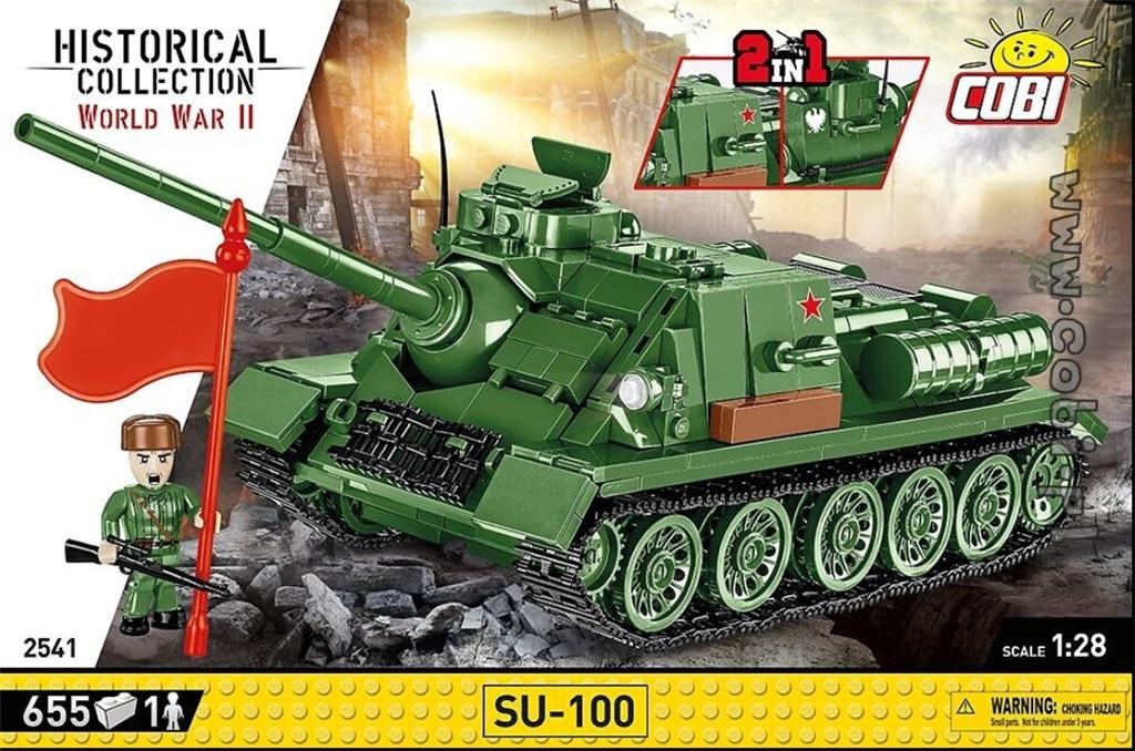 Model działa samobieżnego SU-100 został w całości zaprojektowany z klocków konstrukcyjnych COBI. Zastosowanie aż 655 klocków umożliwiło wiernie odwzorowanie tego pojazdu. Zestaw nie zawiera naklejek. Klocki zostały pokryte wysokiej jakości nadrukami, które nie ścierają się nawet w trakcie intensywnego użytkowania. Model został wyposażony w sprawną trakcję gąsienicową, ruchome działo i otwierane włazy. Pod klapą serwisową znajduje się atrakcyjnie wyglądająca atrapa silnika. Do zestawu dołączone są klocki z oznaczeniami radzieckimi i polskimi do wyboru. Całość uzupełnia figurka żołnierza z karabinem Mosin, czapką uszanką i czerwonym sztandarem. W czytelnej instrukcji zamieszczony jest spis klocków oraz statystyki, które możesz wykorzystać w darmowej Historycznej Grze Bitewnej COBI.