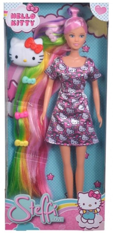 Lalka Steffi ubrana w stylizację ikony popkultury Hello Kitty, atrakcyjną zabawę zapewniają długie, kolorowe włosy, dołączona jest szczotka i zapinki do włosów,