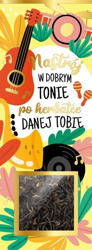 Herbata Kukartka ""Nastrój w dobrym tonie"" Herbatka to wspaniały pomysł na drobny upominek . 50 gram najwyższej jakości herbaty opakowane jest w piękny, zdobiony metaliczną folią kartonik. Cechy szczególne 1 opakowania: - wyjątkowe kolorowe, opakowanie - super jakość herbata - 50 gr - Wymiary 18,5 x 7 x 4 cm, - smaki: Owocowa Pasja- hibiskus płatek, owoc jabłka, dzika róża skórka, skórka pomarańczy, aromat