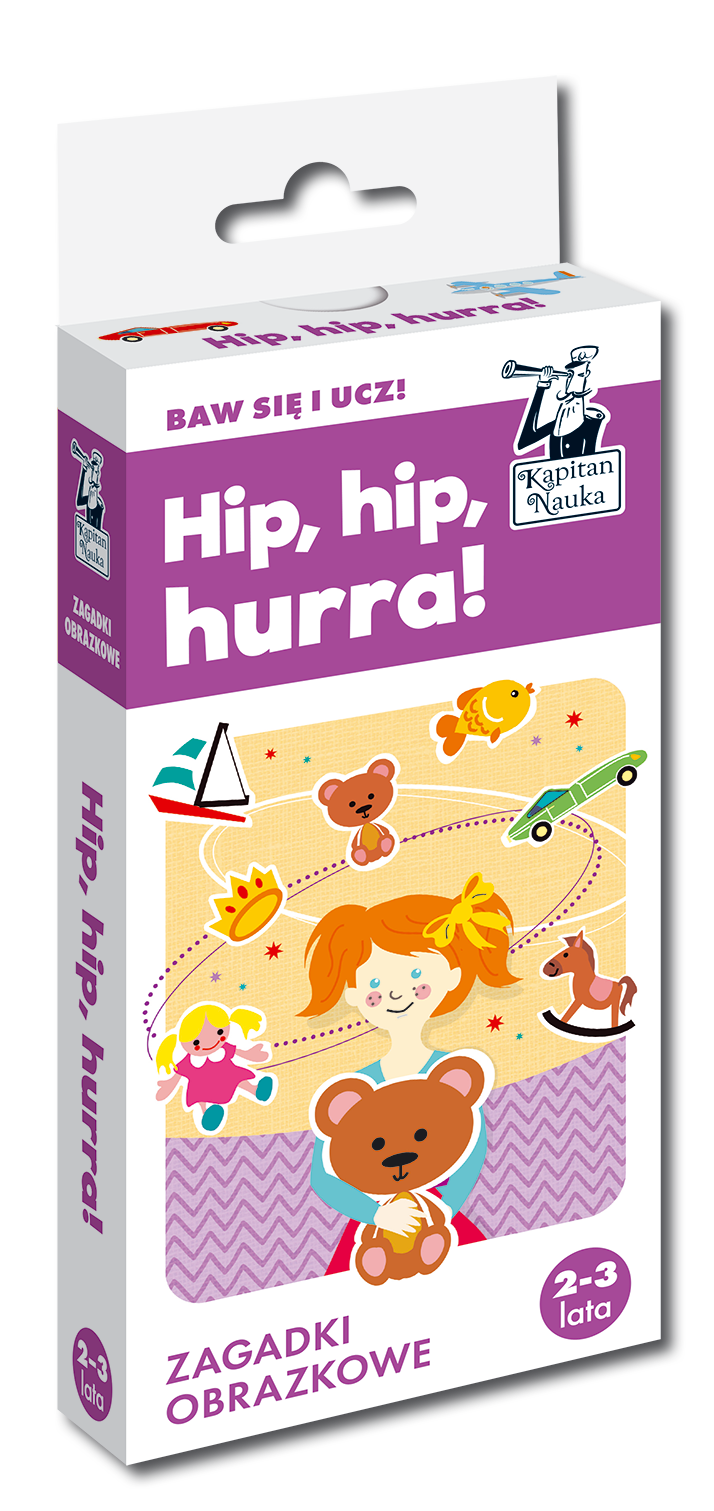 "Hip, hip, hurra! Zagadki obrazkowe" (2-3 lata) to bogato ilustrowana książeczka pełna ciekawych łamigłówek o codziennych sytuacjach dla najmłodszych dzieci. Zawiera niemal 180 zagadek na spostrzegawczość i logikę. Łamigłówki obrazkowe zostały opracowane przez psychologa w taki sposób, aby wspierać rozwój poznawczy i społeczno-emocjonalny dziecka.