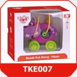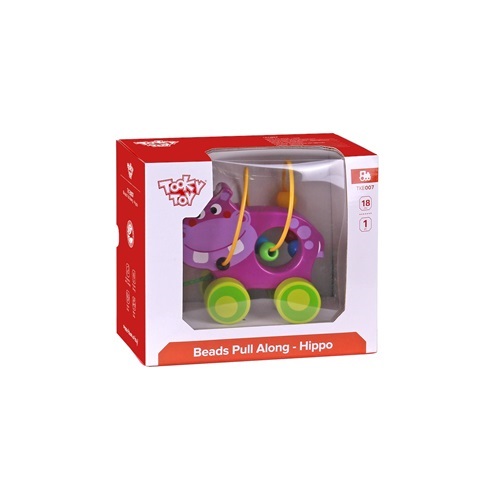 Drewniany Hipopotam ma kółka i sznureczek do ciągnięcia. Dziecko, które opanowało zdolność samodzielnego chodzenia może zabrać Hipcia na spacer. Zabawka wykonana jest z drewna oraz metalowego pręcika, na którym zamocowano 6 kolorowych koralików. Na żółtym labiryncie dziecko może ćwiczyć sprawność manualną. Zabawki Tooky Toy są bezpieczne. Posiadają certyfikaty ekologicznych produktów. Pozbawione ostrych krawędzi, dobrze wygładzone, pomalowane są nietoksycznymi farbami i lakierami. Wiek: 18 m+
