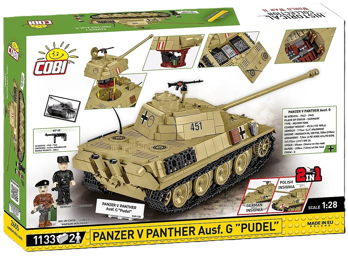 COBI-2655 PANZER V PANTHER AUSF.G "PUDEL" HISTORICAL COLLECTION 1133 elementy Grupa wiekowa: 10+ Skala: 1:28 Zbuduj Panzer V PANTHER Ausf.G "Pudel" od COBI krok po kroku i poczuj, jak ten legendarny pojazd ożywa w Twoich rękach! Konstruując ten czołg, stworzysz imponujący model, który zachwyci każdego miłośnika klocków, kolekcjonera i pasjonata historii. Panzer V PANTHER Ausf.G to jeden z najważniejszych niemieckich czołgów II wojny światowej, a jego wersja "Pudel" zyskała szczególne znaczenie w historii Polski, kiedy to czołg został zdobyty przez powstańców warszawskich w sierpniu 1944 roku. Interaktywna zabawa i realizm - Model wyposażony jest w ruchome działo, otwieraną klapę oraz obrotową i wyjmowaną wieżę czołgową, co zapewnia wyjątkowy realizm i umożliwia kreatywną zabawę. Realistyczna konstrukcja - W zestawie znajdziemy wyjmowany silnik Maybach HL-230, który można wyeksponować obok model Precyzyjne detale historyczne - Zestaw zawiera szczegółowe odwzorowanie karabinów maszynowych oraz gąsienic, które są inspirowane autentycznym sprzętem z II wojny światowej, co czyni model wyjątkowo realistycznym. Kolekcjonerski wymiar - Dwie figurki - niemieckiego czołgisty oraz Polaka Jana Uniewskiego ps. "Lumeński" - który uruchomił zdobyczny czołg w czasie Powstania Warszawskiego, dodają wyjątkowego kontekstu historycznego. Przydomek "Pudel" - Czołg go otrzymał na cześć oficera Tadeusza Tyczyńskiego, który zginął podczas walk, a model oddaje hołd tym, którzy walczyli o wolność Polski. Łatwy i satysfakcjonujący proces budowy - Dzięki szczegółowej instrukcji budowa czołgu jest prosta i przyjemna, a wysokiej jakości klocki COBI gwarantują precyzyjne dopasowanie i trwałość modelu. Kreatywność i satysfakcja - Doskonale wyprofilowane elementy sprawiają, że łączenie klocków jest łatwe i przyjemne, a efekt końcowy daje ogromną satysfakcję z wykonania precyzyjnego, historycznego modelu. Emblematy narodowe - Model posiada emblematy narodowe Polski, takie jak symbol Polski Walczącej i lilia harcerska. Możliwość wymiany na emblematy niemieckie daje Ci pełną swobodę w dostosowywaniu modelu. Rozbudowa kolekcji - Sprawdź inne pojazdy z serii HISTORICAL COLLECTION World War II i stwórz własną, unikalną kolekcję historycznych maszyn! Panzer V PANTHER Ausf.G "Pudel" to idealna okazja, by zbudować jeden z najbardziej znanych pojazdów wojskowych w historii Powstania Warszawskiego, zgłębiając przy tym fascynujące tajemnice przeszłości. Zestaw to także świetny wybór dla dorosłych kolekcjonerów, którzy docenią wysoką jakość i dbałość o detale. 1133 wysokiej jakości elementy, Wyprodukowane w UE przez firmę z ponad 35-letnią tradycją, Spełniają normy bezpieczeństwa dotyczące produktów dla dzieci, W pełni kompatybilne z innymi markami klocków konstrukcyjnych, Czytelna i intuicyjna instrukcja oparta na rysunkach i ikonach, Wymiary modelu: 32 12 12 cm Wymiary pudełka: 45 7 30,5 cm