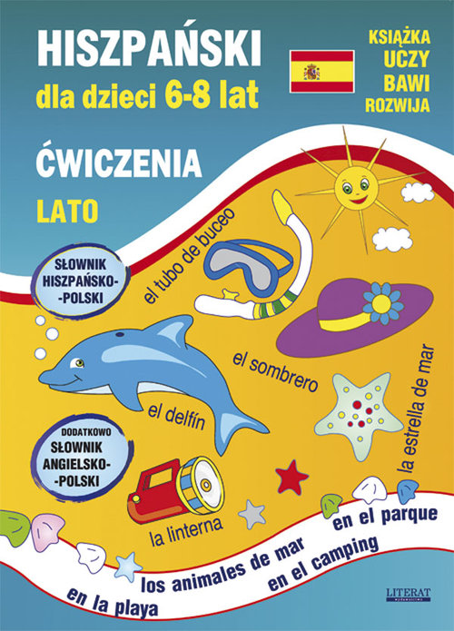 Edukacyjna książka dla dzieci zawierająca różnorodne ćwiczenia ułatwiające naukę języka hiszpańskiego (oraz – dodatkowo – angielskiego) w nauczaniu wczesnoszkolnym. Dziecko pozna i łatwo przyswoi pierwsze dotyczące następujących tematów związanych z latem: Los animales de mar, En el parque, En la playa, En el camping. Zestaw ćwiczeń opiera się na wykorzystaniu pamięci wzrokowej, wspomaga rozwój intelektualny oraz rozwija umiejętności manualne dziecka poprzez rysowanie czy wyklejanie. Dodatkowo zamieszczono minisłowniki hiszpańsko-polski i angielsko-polski. Książkę opracowały doświadczone nauczycielki hiszpańskiego i angielskiego, specjalizujące się w nauczaniu początkowym. „Hiszpański dla dzieci” uczy pisania i wymowy oraz pozwala połączyć naukę z zabawą.