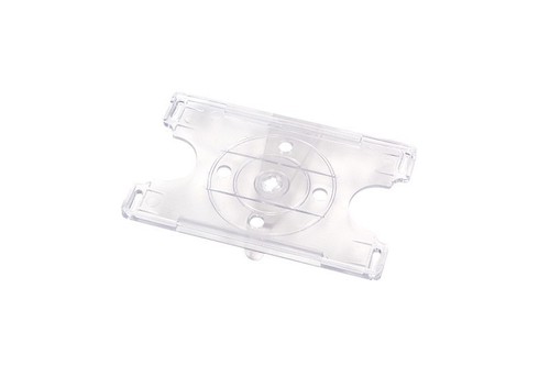 identyfikator sztywny wykonany z mocnego, przezroczystego PVC specjalny mechanizm obrotowy (360°) umożliwia mocowanie do paska w pionie lub poziomie wycięcia ułatwiają umieszczanie/wyjmowanie karty przeznaczony na karty plastikowe, identyfikatory i wizytówki o maksymalnych wymiarach 87x54mm istnieje możliwość przypięcia taśmy kolor przeźroczysty