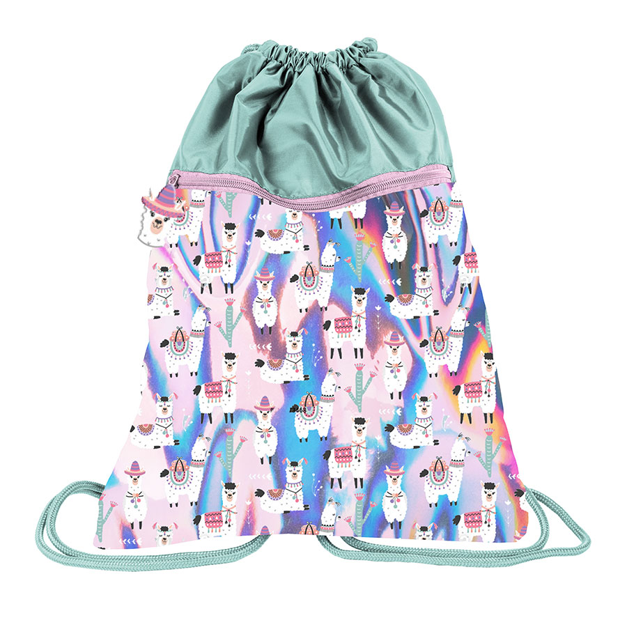 Holograficzny worek na buty. Worek zamykany jest ściągaczem. Posiada grube, plecione sznurki ściągające, umożliwiające noszenie worka na plecach lub na ramieniu. Wyposażony jest w dodatkową kieszeń na zamek. Tył worka jest usztywniony i pokryty siatką.