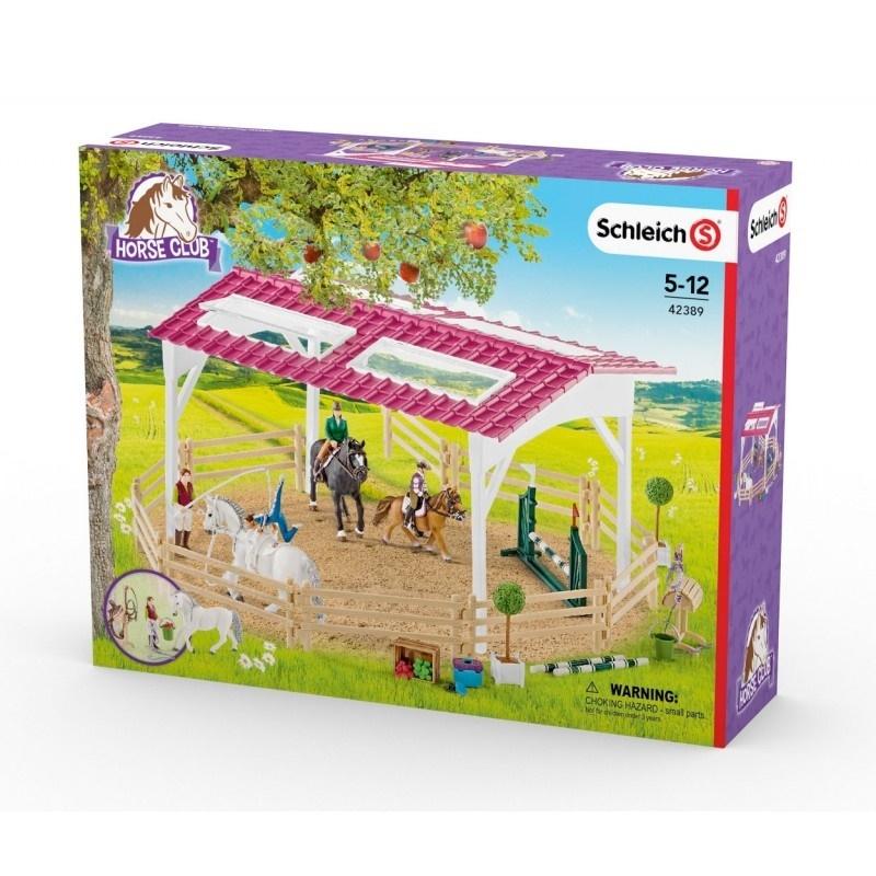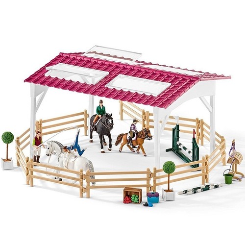 Szkółka jeździecka to okazały zestaw z figurkami jeźdźców, końmi i trenerką oraz sporą ilością dodatkowych elementów, stanowiących niezbędne wyposażenie. Zadaszony i ogrodzony wybieg to miejsce do ćwiczeń jazdy konnej, skoków przez przeszkody i woltyżerki.