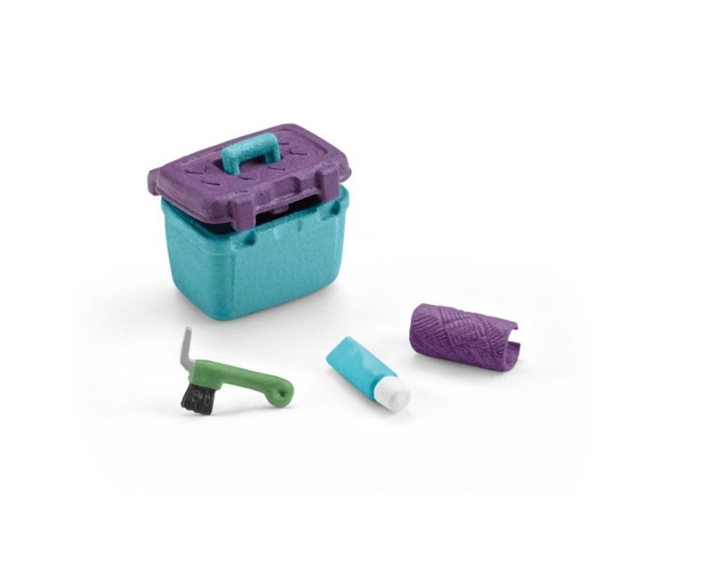 Seria Horse Club zawiera imponującą kolekcję figurek koni z całego świata, a także mnóstwo akcesoriów i budynków, takich jak: stajnie, zagrody, pojazdy, figurki jeźdźców, akcesoria do jazdy konnej, elementy turniejowe, wyposażenie stajni, pożywienie dla zwierząt. Dzięki tak bogatej ofercie, kolekcjonerzy mogą stworzyć piękne scenerie i kolekcje ulubionych końskich ras. Zawartość zestawu: skrzynka na akcesoria kopystka do czyszczenia kopyt bandaż maść Wiek 5-12.