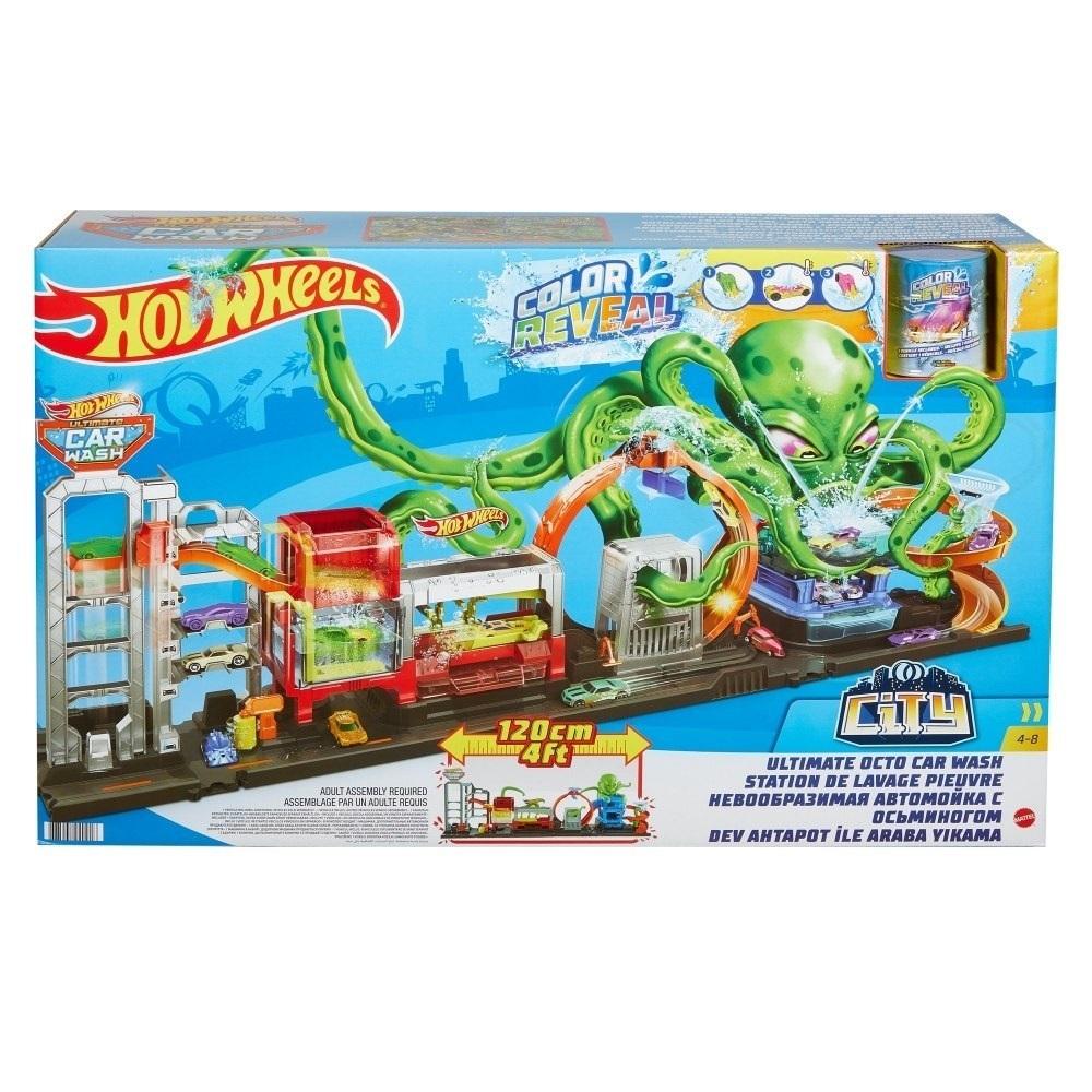 Myjnia samochodowa jest pełna niesamowitych funkcji i zawiera samochód w pudełku Color Reveal. Prosto po wyjęciu z pudełka, pojazd Color Reveal jest pokryty zieloną powłoką, aby rozpocząć przygodę napełnij wodą pierwszy zbiornik na wodę, wrzuć samochód i zakręć nim, by zobaczyć pierwszą odsłonę. Przejedź samochodem przez zestaw który zawiera pętlę, pozwalając aby nadmiar wody spłynął, podziwiając niesamowite szczegóły samochodu. Przed ostatnim myciem napełnij głowę ośmiornicy zimną wodą i spryskaj samochód przez macki, aby odsłonić zupełnie inny wystrój! Użyj ciepłej wody, aby zmienić go z powrotem. Przejedź samochodem przez myjnię i powtarzaj w kółko, aby zobaczyć, jak przełącza się między dwiema ostatnimi zmianami kolorów!