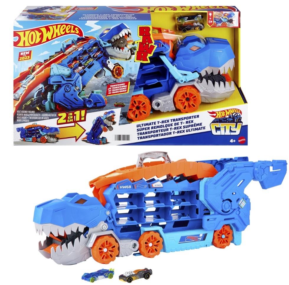 Zestaw T-Rex Mega transporter zawiera 2 samochodziki Hot Wheels(R) w skali 1:64, co sprawia, że to świetny prezent dla dzieci od 4 roku życia.
