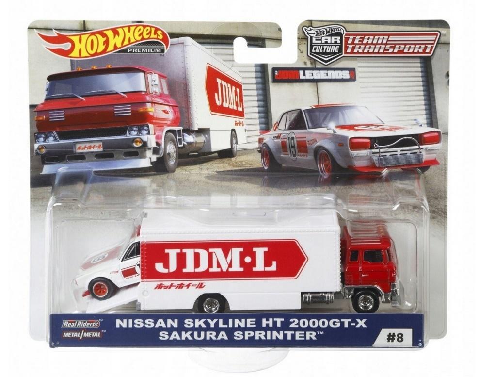 Każda wyścigówka musi mieć swój transporter, który dowiezie ją na miejsce zawodów! Tir-laweta transportowa musi być niezawodna taka, jak Sakura Sprinter. W zestawie Team Transport z serii Hot Wheels Premium Car Culture znajdziesz dwa samochodziki transporter Sakurę i wyścigówkę Nissan Skyline HT 2000GT-X japoński samochód sportowy. Oba zabawkowe samochodziki są metalowe i bazują na wyglądzie rzeczywistych modeli. Pasują również do siebie pod względem kolorystycznym (biało-czerwone).