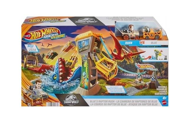Ścigaj się, aby uciec z wyspy Jurassic World na zestawie torów Hot Wheels RacerVerse, który zawiera wyścig dragsterów i tyrolkę na mecie. Zawiera odlewanych ciśnieniowo zawodników Blue the Raptor i Owena z nieusuwalnymi figurkami na siedzeniach kierowców odlewanych ciśnieniowo pojazdów Hot Wheels, przygotowanych do wyścigów na torze. Najszybszy zawodnik dotrze do wieży strażniczej i zjedzie na tyrolce w bezpieczne miejsce, podczas gdy jego przeciwnik wpadnie do otwartej paszczy czekającego mozazaura. Zestaw składa się na pół, co ułatwia przechowywanie. Kolor i dekoracje mogą się różnić.