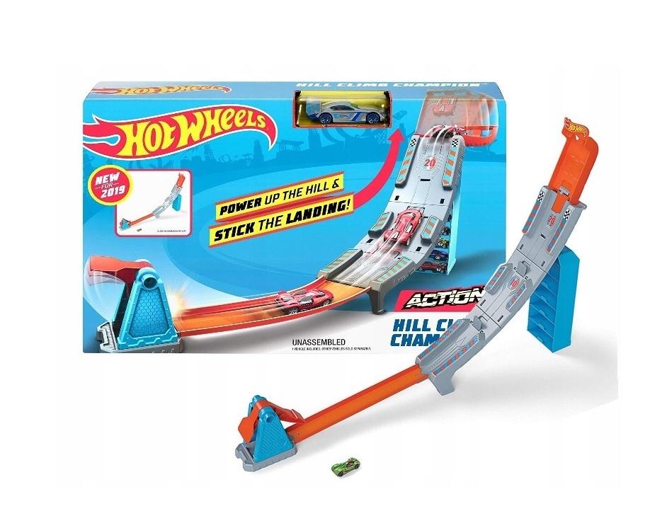 Pociągnij dźwignię w górę i puść, aby rozpocząć odliczanie. Kiedy bramki się otwierają, zaczyna się prawdziwa rywalizacja! W zestawach znajduje się wszystko, czego mali mistrzowie potrzebują do wyścigów od razu po otwarciu opakowania jeden pojazd Hot Wheels, pomarańczowe tory oraz specjalne elementy takie jak wyrzutnie czy zakręty.