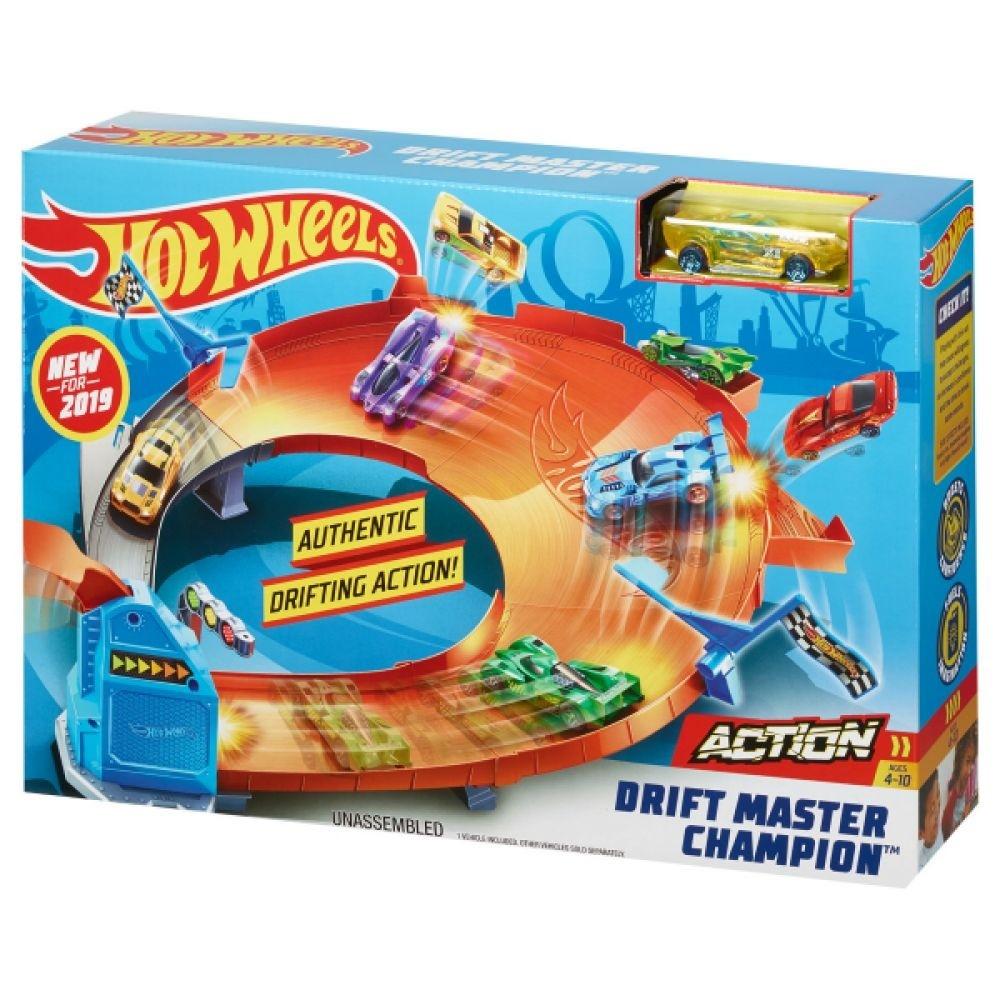Niesamowity zestaw z serii Hot Wheels Action - Drift Master Champion przeniesie dziecko w świat samochodów, które zakręty pokonują bokiem. Ustaw samochód na rampie i pozwól mu swobodnie zjechać, aż dojedzie do wysokości wyrzutnie. Wtedy szybkim zdecydowanym ruchem naciśnij na dźwignię i zobacz jak twój samochód driftuje! Aby uzyskać dodatkowe punkty, strąć flagi, znajdujące się po drodze. W skład zestawu wchodzi tor z wyrzutnią do driftowania oraz jeden samochodzik.