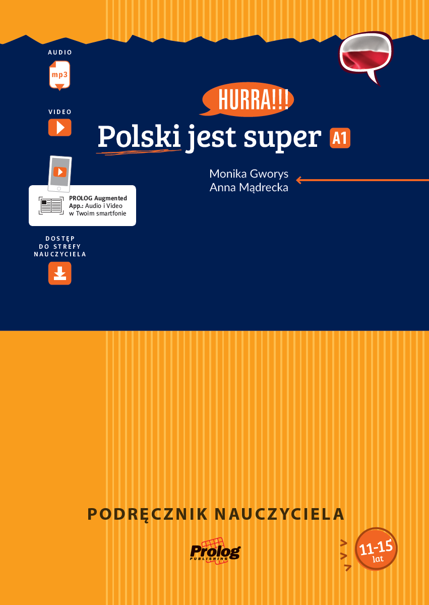 HURRA!!! Polski jest super. A1. Podręcznik nauczyciela: • zawiera szczegółowy opis każdego rozdziału z podręcznika ucznia • prezentuje cele poszczególnych zadań, uwzględnia wskazówki dydaktyczne, jak je przeprowadzić (jest źródłem gotowych scenariuszy lekcyjnych) • prezentuje pomysły na dodatkowe (nieujęte w podręczniku ucznia) aktywności językowe, które rozwijają zasób leksykalny oraz umiejętności językowe ucznia • zawiera gotowe do skopiowania gry planszowe i karciane oznaczone w podręczniku ucznia symbolem kostki do gry • wprowadza dodatkowe (nieujęte w podręczniku ucznia) gry i zabawy językowe, które można wykorzystać na określonym etapie lekcji • uwzględnia propozycje gier, które nie wymagają specjalnych materiałów do przygotowania czy skopiowania • posiada zestaw kart obrazkowych (fiszek leksykalnych) do każdego rozdziału • podaje propozycje gier językowych z wykorzystaniem kart obrazkowych • wskazuje określone ćwiczenia z zeszytu ćwiczeń, które uczeń może wykonać na danym / określonym etapie lekcji • ma w swoim składzie kartkówki przeznaczone do samooceny uczniów (3 do każdego rozdziału, sprawdzające leksykę, gramatykę oraz sprawność pisania) • daje dostęp do Strefy Nauczyciela z filmami online, grami, flashcardami, planszami, kartkówkami z podręcznika w wersji do druku oraz materiałami dodatkowymi do alternatywnej realizacji materiału. Bohaterowie podręczników, filmów i nagrań audio to grupa nastolatków w różnym wieku, których łączy wspólna pasja dziennikarska. Prowadzą razem blog KLUB REPORTERA. Nagrywają filmiki, prezentują nie tylko życie szkoły, ale też swoje pasje, opowiadają o podróżach, wakacjach, rodzinie, domu i rozmaitych ważnych dla nich wydarzeniach. Przykładowe strony: Pragnę podkreślić, że na polskim rynku wydawniczym nie było dotąd publikacji adresowanej do wskazanej przez Autorki grupy docelowej, która stanowiłaby tak rozbudowaną całość. Dodatkowym atutem publikacji jest podporządkowanie całości podejściu komunikacyjnemu i działaniowemu. Tym samym motywowanie odbiorcy do nauki poprzez wskazywanie, iż zyskuje umiejętności, które może wykorzystać poza sytuacją lekcyjną.(…) Praca zasługuje na uznanie i przyczyni się nie tylko do podniesienia kompetencji językowej osób uczących się, zainteresuje młodych ludzi Polską, ale także będzie motywować do dalszej nauki. Podręcznik i towarzyszące mu pomoce zachęcają młodego odbiorcę nie tylko treściami, które pozwalają mu w języku polskim opisać świat i swoje doświadczenia, ale także formą podanych treści. Motywują go do działań językowych, autonomizacji procesu uczenia się (nie uczę się języka, bo muszę, ale chcę). Szata graficzna i audiowizualna są atutem publikacji. Podobnie wprowadzanie licznych zabaw i gier językowych odnosi się do czynnika rywalizacji oraz aktywnego udziału ucznia.  - z recenzji dr hab. Aleksandry Achtelik, prof. UŚ