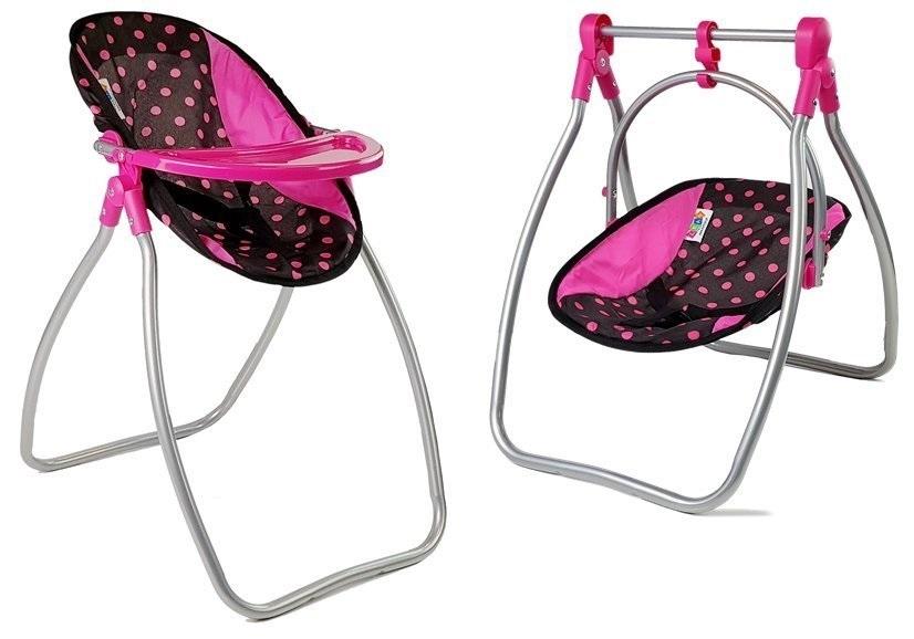 Huśtawka dla Lalek Krzesełko do Karmienia Alice Czarno-Różowa Opieka nad lalkami przebieranie, karmienie to coś, w co każda mała dziewczynka lubi się bawić. Huśtawka z krzesełkiem do karmienia to jedna z rzeczy, które na pewno urozmaicą zabawę, stanie się ciekawsza i doda realizmu. Krzesełko posiada stabilne nogi wykonane z aluminium. Zabawka ma dwa zastosowania jako huśtawka i krzesełko do karmienia. Czarny materiał w białe kropki ma po boku ciemno różowe paski. Łączenia wykonane są z plastiku w kolorze czarnym. Po nakarmieniu swojej lalki możesz ululać ją do snu, bujając na huśtawce. Zajmuje mało miejsca, zmieści się w każdym miejscu w pokoiku dziewczynki. Cechy takie jak opiekuńczość, troskliwość to tylko niektóre z cech, które będą rozwijać się u dziecka. Nauczy się także jak opiekować się małym bobasem. Aby zmienić huśtawkę na krzesełko wystarczy ściągnąć górny drążek, odpowiednio dopasować siodełko na stelaż i dołożyć stolik. Gotów! Wymiary huśtawki: 36 cm x 42 cm x 47 cm Wymiary krzesełka: 36 cm x 42 cm x 57 cm Wymiar opakowania: 51 cm x 36,5 cm x 6,5 cm Huśtawka przeznaczony jest dla dziewczynki od 3 roku życia. Prezentowany model został wykonany z wysokogatunkowych, a przede wszystkim atestowanych materiałów, co odpowiada za wysoką jakość i żywotność zabawki. Wózek oznakowany jest certyfikatem CE, który stanowi potwierdzenie spełnienia wszelkich wymagań dyrektyw Unii Europejskiej. Dziecięcy wózek do przewożenia lalek zapakowany jest w oryginalne, kartonowe pudełko.