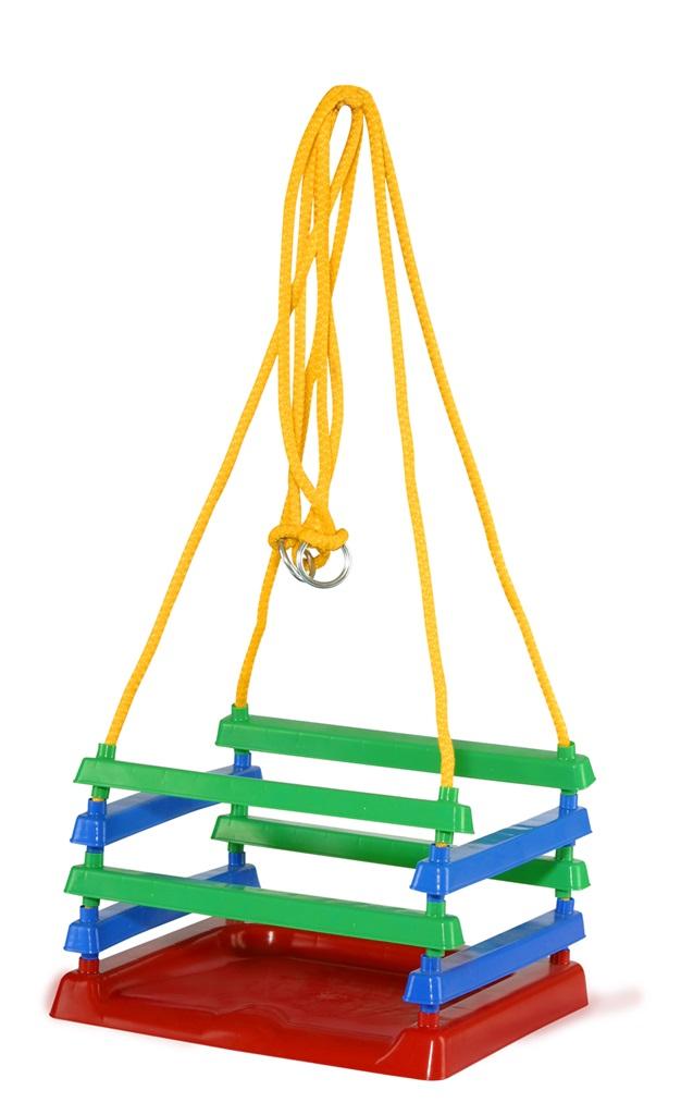 Huśtawka oprócz plastikowego siedziska posiada plastikowe szczebelki zabezpieczające przed wypadnięciem dziecka. Produkt oferowany jest w różnych wariantach kolorystycznych.