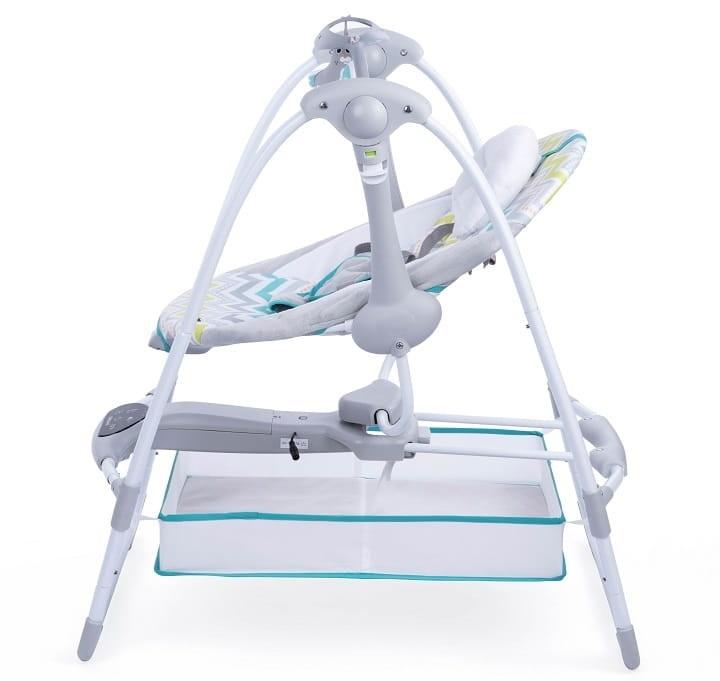Komfortowa huśtawka, która kryje w sobie mnóstwo przydatnych funkcji. Znajdziemy tu odczepiany pałąk z zabawkami, pojemnik na najpotrzebniejsze drobiazgi, odczepiany zagłówek, funkcję wibracji i panel dotykowy, który odpowiada za uruchamianie melodii, sterowanie prędkością bujania i programowanie timera. Do wyboru mamy 3 różne nastawy czasowe, dzięki czemu w łatwy sposób dostosujemy huśtawkę do indywidualnych potrzeb maluszka. Blokada bujania umożliwi korzystanie z huśtawki w trybie statycznym, a antypoślizgowe nóżki i 5-punktowe pasy zadbają o bezpieczeństwo dziecka. Możliwość złożenia huśtawki na płasko ułatwia jej przechowywanie oraz przenoszenie. W zestawie znajduje się adapter, umożliwiający podłączenie Swing TuliLuli Deluxe do prądu. Funkcja zasilania bateryjnego pozwala skorzystać z huśtawki wszędzie tam, gdzie nie mamy dostępu do zasilania sieciowego.