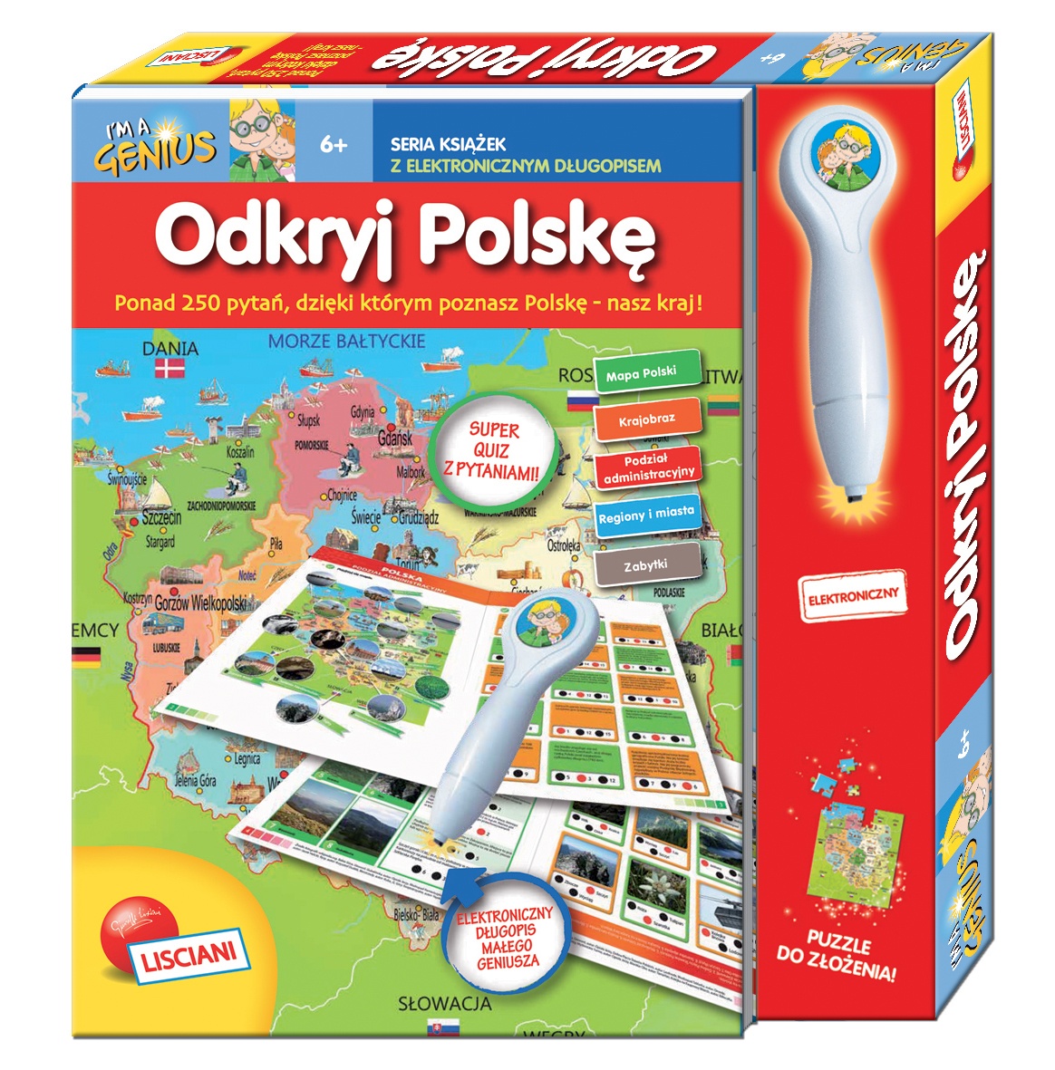 Książeczka z serii ""Maxi Elektroniczny Długopis"". Ponad 250 pytań w formie quizu na temat naszego kraju. Pytania dotyczą parków narodowych, zabytków, miast, regionów czy znanych postaci. Dzieci odpowiadają na pytania interaktywnym długopisem. Ilość stron:32 (twarda oprawa, miękkie kartki), akcesoria: interaktywny długopis I'm A Genius!. puzzle 120 el. z mapami Polski.