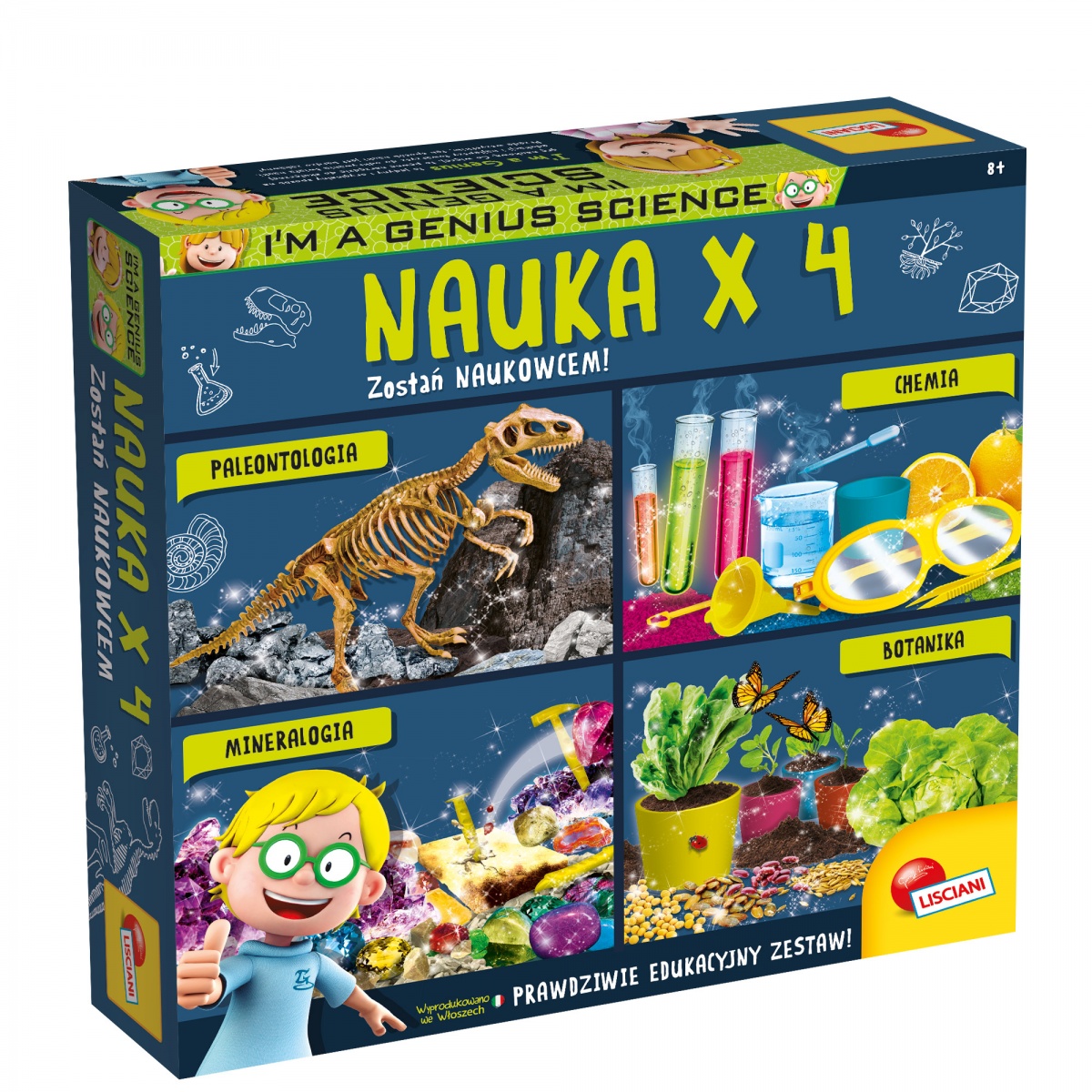 Zestaw multinaukowy Nauka x4 to nowość w serii I'm a genius, będącej od wielu lat bestsellerem na polskim rynku gier naukowych. Podczas wykonywania eksperymentów, które uszeregowane są według rosnącego stopnia trudności, dzieci będą miały także okazję poznać teoretyczne podstawy z danej dziedziny. Wiedza przedstawiona jest przy użyciu języka zrozumiałego dla dzieci, które później mają szansę na pełniejsze zrozumienie omawianych aspektów podczas wykonywania eksperymentów. W tym zestawie znajdują się: W tym zestawie znajdują się: paleontologia, chemia, mineralogia oraz botanika..