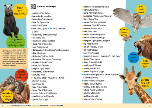 Obrazkowy słownik angielsko-polski, polsko-angielski jest kolejną nowością w serii "Idę do szkoły". Słownik został opracowany przez nauczycielkę języka angielskiego z myślą o uczniach klas 1-3. Wybrane zagadnienia są oparte na programie nauczania realizowanego w pierwszych latach szkoły podstawowej i wzbogacone o ciekawostki językowe i kulturowe. Publikacja jest podzielona na dwie części: Pierwsza to angielsko-polski słownik tematyczny, w którym dziecko może szybko znaleźć słowa związane z konkretnym tematem, na przykład ze zwierzętami; przy każdym temacie znajduje się kod QR, który po zeskanowaniu go odsyła ucznia do strony z nagraniami wymowy słówek. Druga to polsko-angielski słownik w układzie alfabetycznym, w którym można znaleźć odpowiedniki polskich słówek. Istotnym wyróżnikiem słownika są grafiki ułatwiające zapamiętywanie.