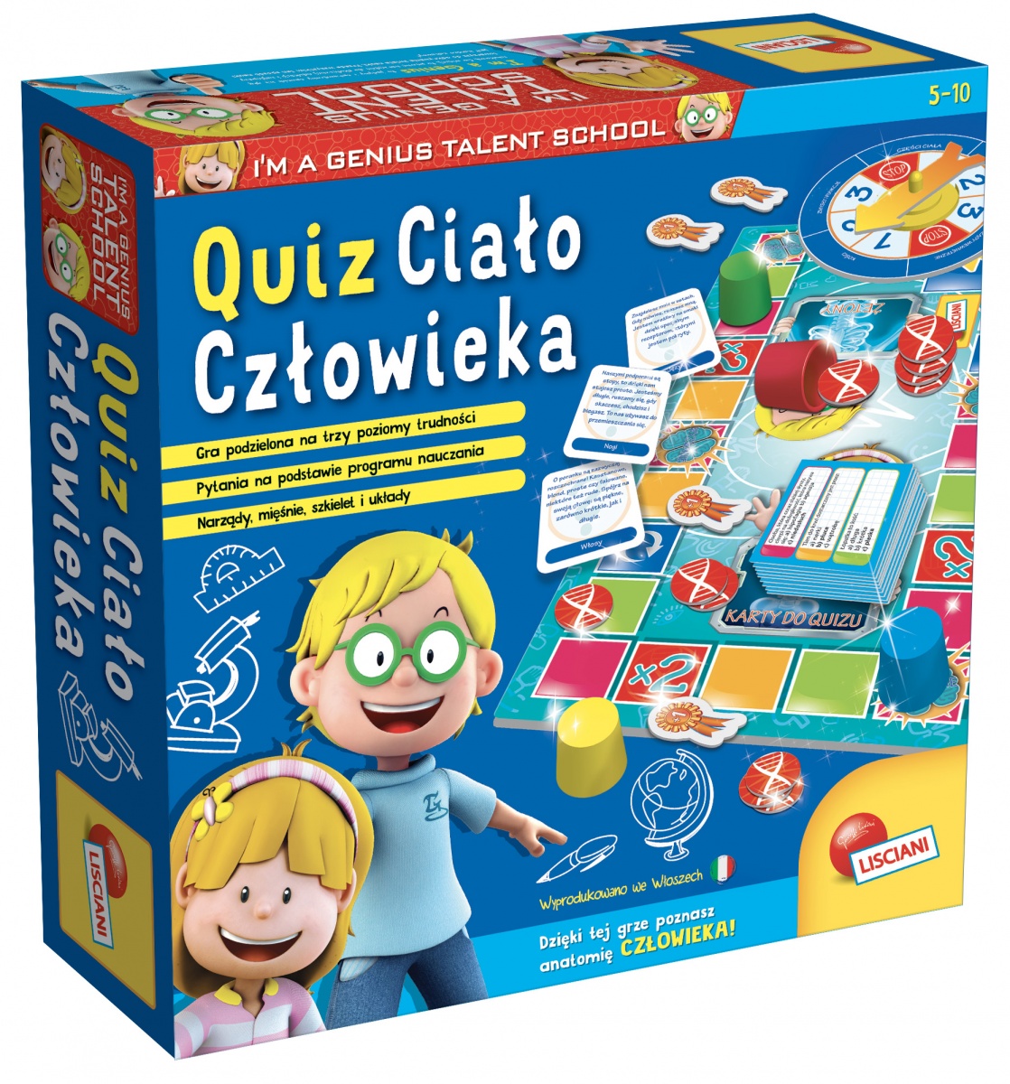Gra stworzona na zasadzie quizu,opracowana na podstawie programu szkoły podstawowej, dzięki której dzieci poznają budowę ciała człowieka oraz jego narządy. Gra jest podzielona na trzy poziomy trudności. Zawartość: 48 kart, 4 pionki, spinner, plansza, żetony, odznaki. Dla dzieci w wieku od 5 do 10 lat