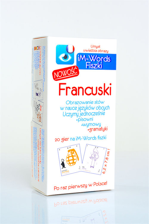 Umysł uwielbia obrazy! Nowatorska (stworzona w Polsce) metoda specjalnie stworzona do nauki słów z języków obcych za pomocą obrazów. Każda fisz-karta (fiszka) posiada obrazek iM-Words, który uczyni twoją naukę kolorową i jeszcze bardziej zajmującą. W obrazku jest zakodowana podpowiedź wymowy lub pisowni wyrazu obcego oraz podstawowa zasada gramatyczna dotycząca tego wyrazu. Oprócz tego budowa fiszki iM-Words pozwala na urozmaicenie nauki za pomocą gier IM-Words. Górny rząd liter wskazuje, jak zgodnie z zasadami gier iM-Words dobierać i grać fisz-kartami iM-Words czyniąc naukę jeszcze bardziej zajmującą. Każdy awers dodatkowo posiada oznaczenie języka, dzięki temu możesz uczyć się nie tylko jednego języka, dodatkowo urozmaicając sobie naukę. A oprócz tego każda iM-Words fisz-karta jest zrobiona z wysokiej jakości papieru kredowego i o dużym rozmiarze 7,8 x 6,2 cm! Dzięki temu masz większy komfort nauki. Każdy zestaw składa się z: - 300 kolorowych fisz-kart z obrazkami iM-Words, - opis metody iM-Words, - pudełko do iM-Words fisz-kart, - zasady 20 gier iM-Words - pionki, kostka, specjalne fisz-karty do gier.