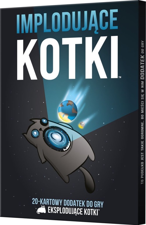 Zupełnie nowe karty, zupełnie nowe żarty, jeszcze więcej wybuchów i dodatkowy, szósty gracz przy stole! To i jeszcze więcej znajdziecie w tym niepozornym pudełeczku, które stanowi dodatek do puchatej rosyjskiej ruletki – Eksplodująch Kotków. Wraz z rozszerzeniem do gry dołącza nowy rodzaj karty – Implodujący Kotek. Gdy pociągniesz go z talii, nie wybucha od razu! Zamiast tego umieszczasz go w wybranym przez siebie miejscu talii ODKRYTEGO, więc od tej pory będzie wiadomo, gdzie się znajduje. Gracz, który będzie musiał go dobrać, będzie w nie lada opałach, bo na Implodującego Kotka nie działa karta rozbrojenia. Uwaga! To nie jest samodzielna gra! Do rozgrywki wymagana jest podstawowa wersja gry: Eksplodujące Kotki. Zawartość pudełka: 20 kart kołnierz wstydu instrukcja Wiek 12+