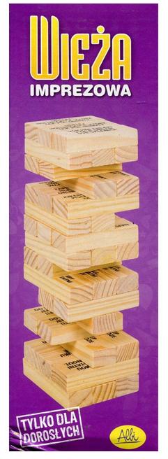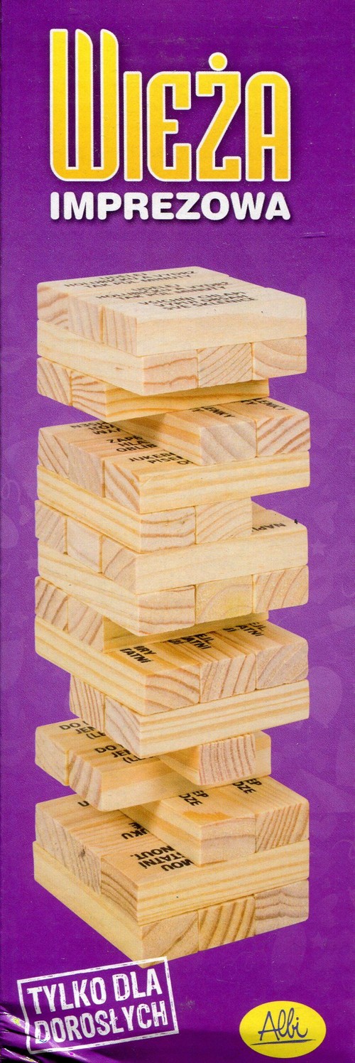 To nowa odsłona tradycyjnej Jengi w wydaniu na imprezę. Zasady gry są podobne, chodzi o to, żeby ostrożnie wyciągać klocki. Jednak na każdym klocku są zapisane zadania, które należy wykonać. Za niewykonanie zadania trzeba oddać fant. Przed rozpoczęciem gry, zawodnicy ustalają zadanie główne czyli zadanie, jakie będzie musiał wykonać zawodnik, który zburzy wieże z klocków. Przed grą każdy z graczy musi się wyposażyć w kieliszek/szklankę napoju. Gra TYLKO dla dorosłych graczy +18 Gra zawiera 48 klocków z zadaniami. Czas rozgrywki – 30 minut Minimum 2 graczy
