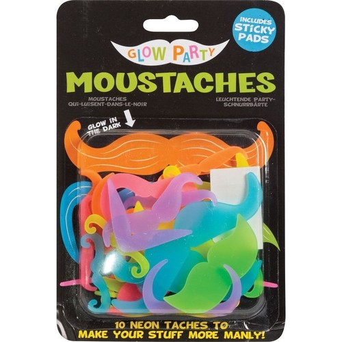 Gadżet na imprezę w postaci zestawu 10 plastikowych wąsów, każdy z nich ma inny wygląd. Wąsy można naklejać na twarz. Każdy z wąsów ma bardzo jaskrawą barwę i dodatkowo posiada warstwę fluorescencyjną. Po naświetleniu gadżetu będzie on emitował jaskrawe światło w ciemnościach. Pełny zestaw to 24 blistry z wąsami. Dla dzieci w wieku od 3 lat