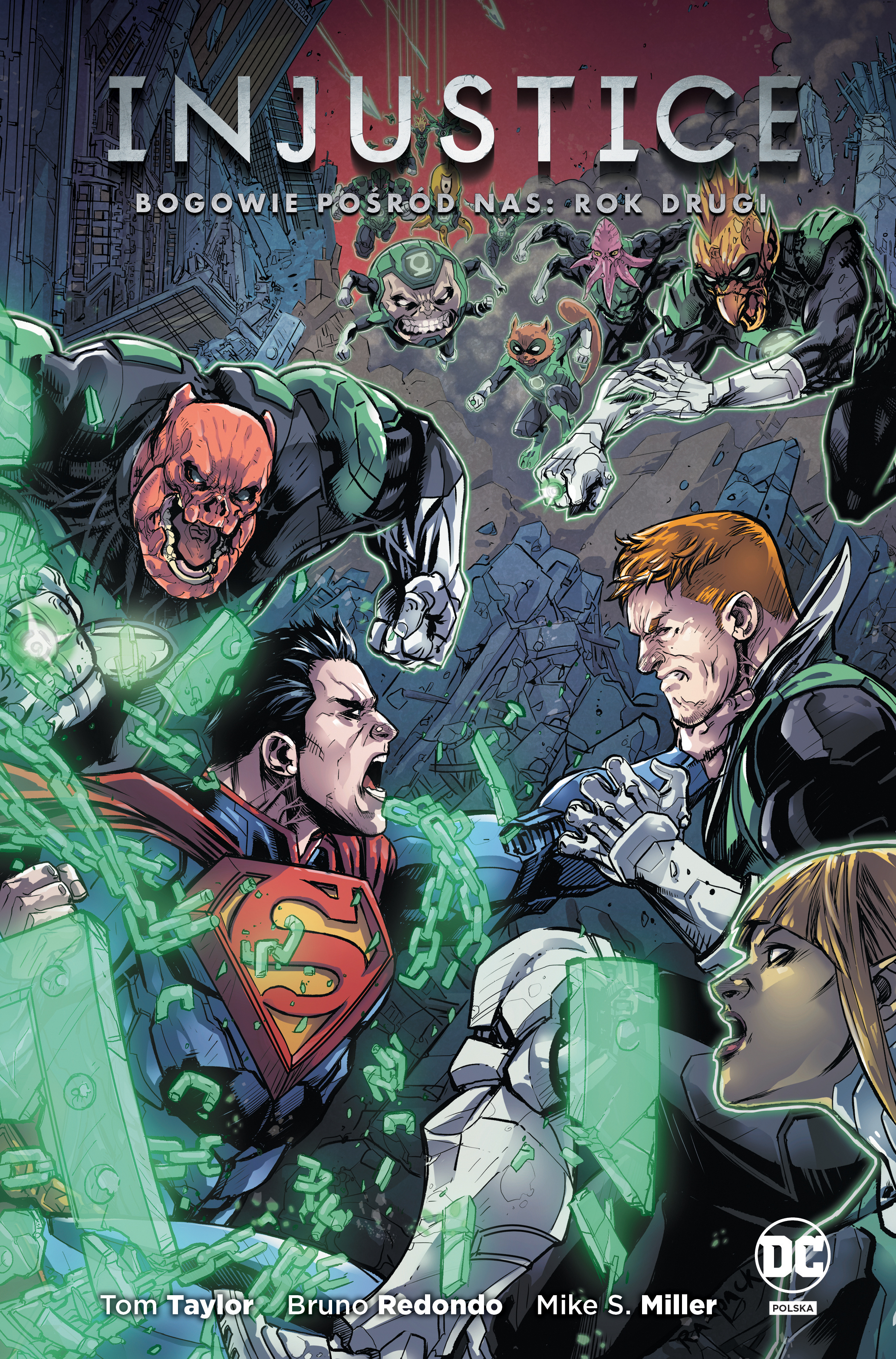 Superman był największym ziemskim bohaterem. Nie mógł jednak ochronić domu, żony ani rodziców przed Jokerem. Postanowił, że jedyną drogą do zaprowadzenia pokoju na Ziemi będzie zakończenie wszystkich konfliktów. Zaczął od przebicia pięścią piersi Jokera. A później poszerzał skalę działań. Batman pozostaje wierny przekonaniu, że każdy zasługuje na uczciwy proces, niezależnie od rozmiaru popełnionych zbrodni. Obecnie prowadzi ruch oporu, który przeciwstawia się autorytarnym rządom byłego przyjaciela. Członkowie Korpusu Zielonych Latarni zauważyli drastyczne zmiany, jakie zaszły na Ziemi, i wyruszają na nią z zamiarem interwencji. Superman ma jednak ważne pytanie, które chce zadać ich przywódcom: dlaczego pozwolili na zagładę Kryptona? Komiks równie wypełniony akcją jak fenomenalna gra, która była inspiracją do jego powstania. „Injustice: Bogowie Pośród Nas – Rok Drugi” opowiada historię świata, w którym istoty o niemal boskich mocach próbują zaprowadzić porządek. Scenarzysta Tom Taylor („DCeased”, „Suicide Squad: Zła Krew”) oraz rysownicy Bruno Redondo („Batman: Arkham Unhinged”) i Mike S. Miller („A Game of Thrones”) oraz cała rzesza znakomitych artystów zapraszają do lektury drugiego tomu bestellerowej serii. Album zawiera materiały opublikowane pierwotnie w amerykańskich zeszytach w formie cyfrowej jako „Injustice: Gods Among Us Year Two” #1–24, a później drukowanej jako „Injustice: Gods Among Us Year Two” #1–12 i „Injustice: Gods Among Us Year Two Annual” #1.