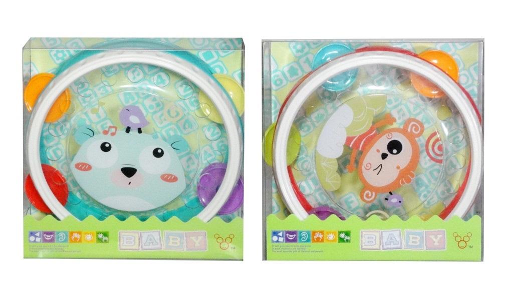 Kolorowe tamburynki na których widnieją sympatyczne zwierzątka. Wprowadzą dziecko w ciekawy świat muzyki. Produkt zapakowany w przezroczyste pudełko. Podane wymiary stanowią wymiar opakowania. Produkt występuje w kilku wersjach kolorystycznych.