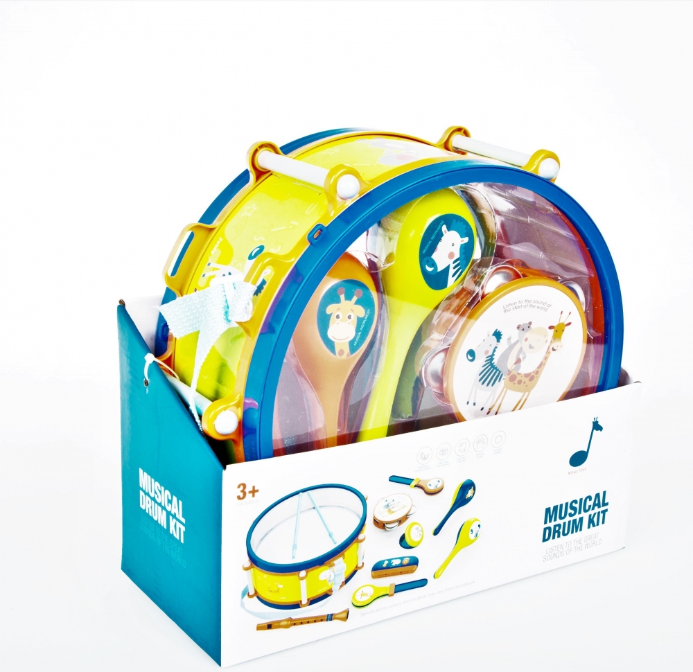 Zawartość zestawu bębenek, tamburyn, marakasy, harmonijka, flet prosty, 2 x pałeczki.