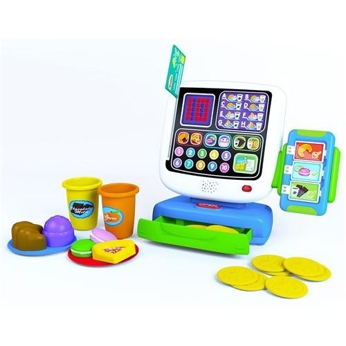 Kasa mówi po polsku. Ma inteligentny system zamówień. Ekran LED wyświetla litery, cyfry i animacje. Wydaje zabawne dźwięki i melodie. Ma regulację głośności. Rozwija wyobraźnię i umiejętności komunikacyjne. Uczy cyfr, liter i kształtów. Ćwiczy koordynację rąk i oczu. W skład zestawu wchodzą: Kasa z ekranem LED i wyskakującą szufladką Produkty, kubeczki, talerzyki Karta kredytowa i monety Suwak do karty Panel do składania zamówień Dla dzieci w wieku od 2 lat