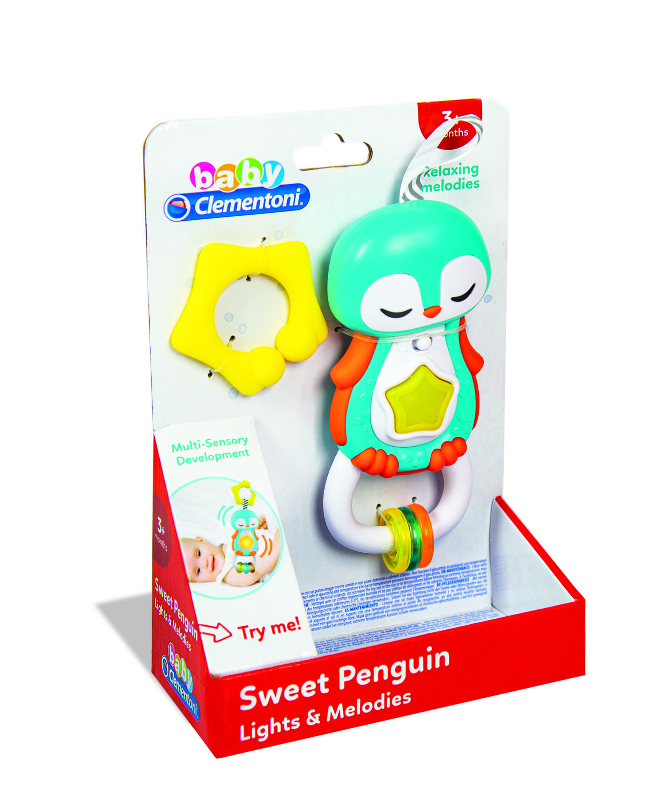 Potrząsana grzechotka wydaje z siebie zabawny dźwięk, a praktyczna obręcz umożliwia przymocowanie pingwina do kołyski lub wózka.