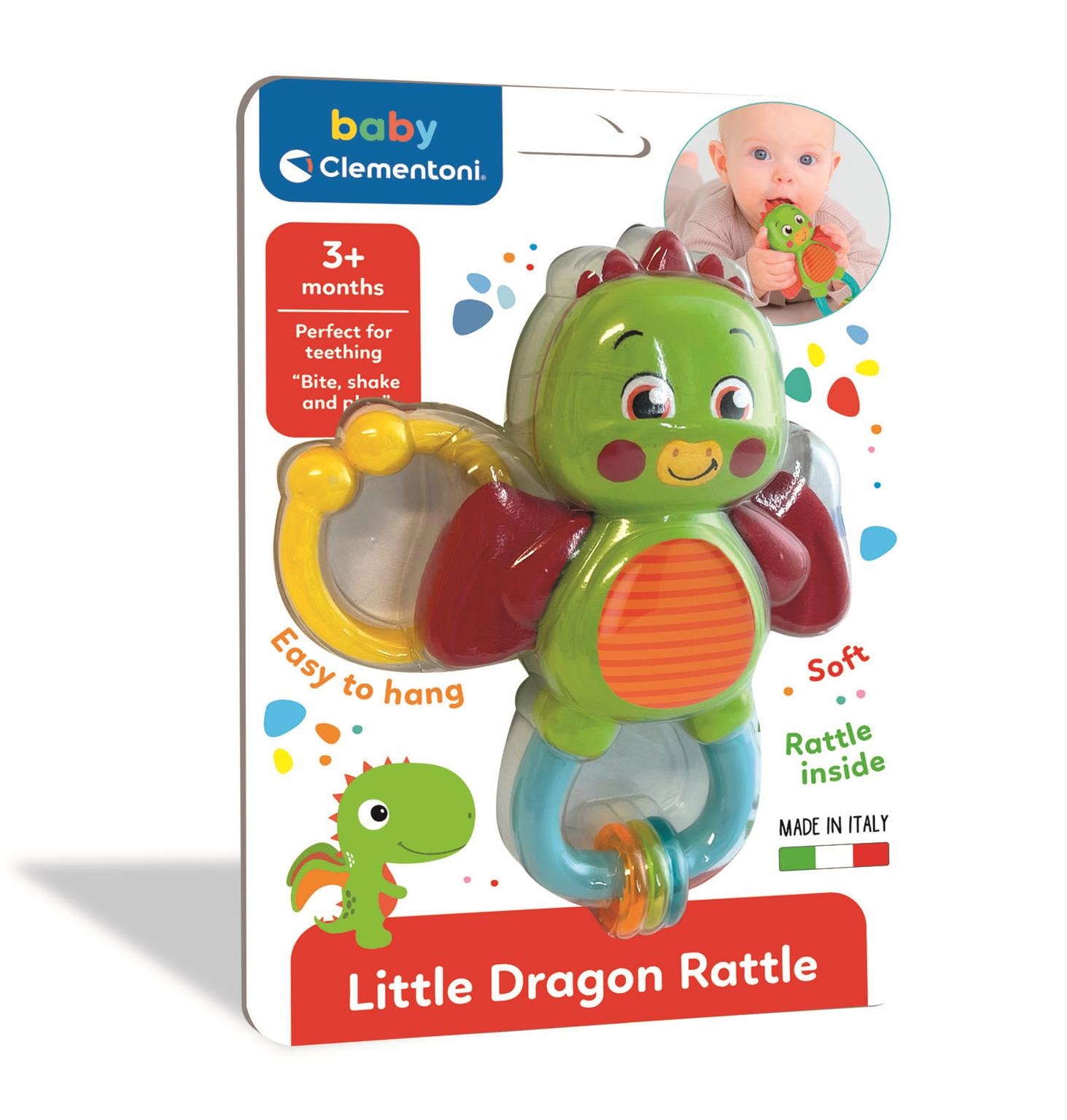 Kolorowa grzechotka z podobizną sympatycznego smoka, wzbogacona elementami z miękkiej i bezpiecznej gumy.Dźwięki grzechotki i jej wesołe kolory wspomagają rozwój percepcji słuchowej i wzrokowej. komplecie trzy miękkie kółeczka oraz okrągły zaczep do zawieszenia zabawki.Stymuluje zręczność manualną i rozwój multisensoryczny.
