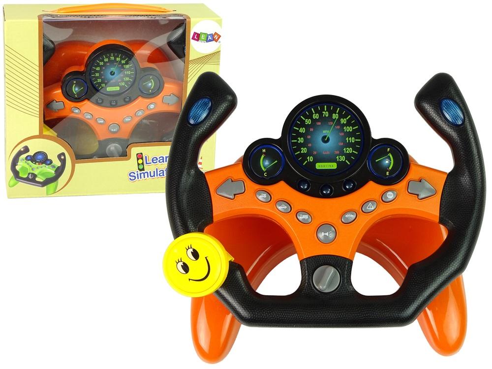 Interaktywna Kierownica Sportowa Pomarańczowa Dla Dzieci Dźwięki Światła Interaktywna kierownica to niesamowity prezent dla każdego dziecka, które chce się sprawdzić w roli kierowcy. Zabawka sprawia mnóstwo frajdy, ale także wpływa pozytywnie na rozwój malucha. Kierownica jest w kolorystyce pomarańczowo- czarnej. Cała kierownica ma 9 przycisków w tym dwa kierunkowskazy, klakson oraz sygnały służb ratunkowych. Wystarczy, że przekręci kluczyk startu i może rozpocząć zabawę ! Zegary na kierownicy podświetlają się na niebiesko. Sportowy wygląd oraz diody sprawią, że maluch poczuje się jak na torze wyścigowym, prowadząc swoje autko. Kierownica pasuje idealnie do rączki malucha, podstawka posiada przyssawki, należy przymocować ją do stołu i cieszyć się zabawą! Naciskając kolejno przyciski, bardzo łatwo dziecko nauczy się podstawowych zasad ruchu drogowego. Każdy przycisk to inna funkcja, po naciśnięciu jednego z nich usłyszymy słowa po angielsku tłumaczące po kolei znaczenie. Kierunkowskazy brzmią jak w prawdziwym aucie, co dodaje realizmu zabawce. Teraz Twoje dziecko może prowadzić samochód razem z Tobą. Wymiary kierownicy: 24 cm x 19 cm x 6 cm Wymiary opakowania: 26 cm x 22 cm x 11 cm Prezentowana zabawka przeznaczona jest dla wszystkich dzieci powyżej 3 roku życia. Wykonana jest z bezpiecznych dla maluszków, atestowanych materiałów, dzięki czemu posiada certyfikat CE. Zestaw bardzo efektownie i estetycznie wykonany. By dziecko mogło korzystać ze wszystkich funkcji zabawki, należy umieścić w niej trzy sztuki baterii AA 1,5 V, które nie są dołączone do zestawu.