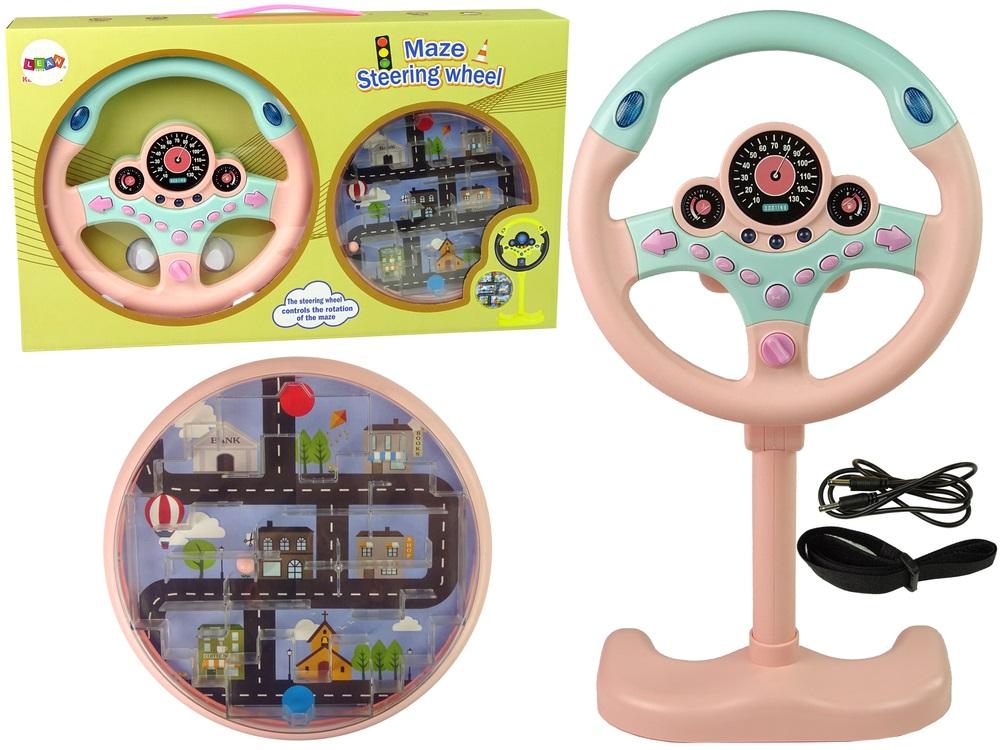 Interaktywna Kierownica Różowa Na Nóżce Dźwięki Światła Miasteczko Labirynt Kulka Interaktywna kierownica to niesamowity prezent dla każdego dziecka, które chce się sprawdzić w roli kierowcy. Zabawka sprawia mnóstwo frajdy, ale także wpływa pozytywnie na rozwój malucha. Kierownica jest w kolorystyce różowo-miętowej. Cała kierownica ma 9 przycisków w tym dwa kierunkowskazy, klakson oraz sygnały służb ratunkowych. Wystarczy, że przekręci kluczyk startu i może rozpocząć zabawę ! Zegary na kierownicy podświetlają się na niebiesko. Wygląd oraz diody sprawią, że maluch poczuje się jak na prawdziwej ulicy, prowadząc swoje autko. Kierownica pasuje idealnie do rączki malucha. Czas na symulacje jazdy w wykonaniu Twojego dziecka. Naciskając kolejno przyciski, bardzo łatwo dziecko nauczy się podstawowych zasad ruchu drogowego. Każdy przycisk to inna funkcja, po naciśnięciu jednego z nich usłyszymy słowa po angielsku tłumaczące po kolei znaczenie. Kierunkowskazy brzmią jak w prawdziwym aucie, co dodaje realizmu zabawce. Teraz Twoje dziecko może prowadzić samochód razem z Tobą. W zestawie znajduje się także labirynt miasteczko z kulka. Umieszczony został na podstawce, obracając nim, może zmienić położenie kulki. Jest też inny sposób sterowania! Za pomocą kabla USB może połączyć ze sobą kierownicę z labiryntem, od teraz kierownicą można sterować przemieszczanie się kulki. Czas na wyzwanie, aby kulka trafiła do mety. Zabawa od malucha będzie wymagać nie lada skupienia, logicznego myślenia i wyobraźni, w jakim sposób ma trafić do celu. Czas na przejażdżkę! Wymiary kierownicy: średnica 25 cm wysokość 4 cm Wymiary labiryntu: średnica 20 cm wysokość 8 cm Wymiary całej zabawki: 25 cm x 25 cm x 12 cm Wymiary opakowania: 50 cm x 30 cm x 10 cm Prezentowana zabawka przeznaczona jest dla wszystkich dzieci powyżej 3 roku życia. Wykonana jest z bezpiecznych dla maluszków, atestowanych materiałów, dzięki czemu posiada certyfikat CE. Zestaw bardzo efektownie i estetycznie wykonany. By dziecko mogło korzystać ze wszystkich funkcji zabawki, należy umieścić w niej trzy sztuki baterii AA 1,5 V, które nie są dołączone do zestawu.