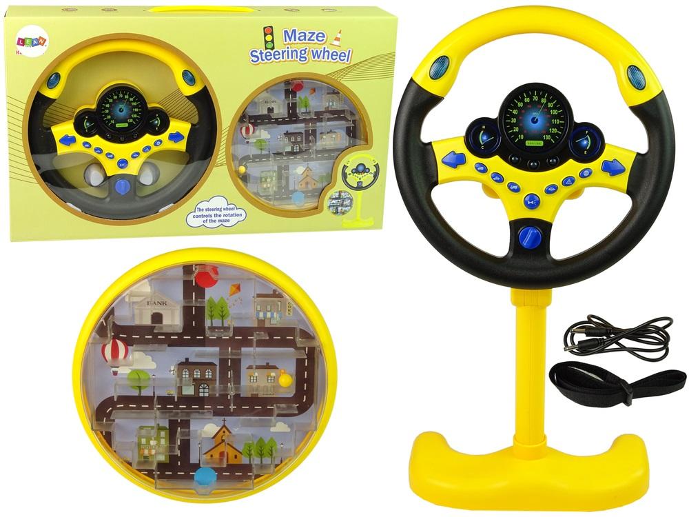 Interaktywna Kierownica Żółta Na Nóżce Dźwięki Światła Miasteczko Labirynt Kulka Interaktywna kierownica to niesamowity prezent dla każdego dziecka, które chce się sprawdzić w roli kierowcy. Zabawka sprawia mnóstwo frajdy, ale także wpływa pozytywnie na rozwój malucha. Kierownica jest w kolorystyce żółto- czarnej. Cała kierownica ma 9 przycisków w tym dwa kierunkowskazy, klakson oraz sygnały służb ratunkowych. Wystarczy, że przekręci kluczyk startu i może rozpocząć zabawę ! Zegary na kierownicy podświetlają się na niebiesko. Wygląd oraz diody sprawią, że maluch poczuje się jak na prawdziwej ulicy, prowadząc swoje autko. Kierownica pasuje idealnie do rączki malucha. Czas na symulacje jazdy w wykonaniu Twojego dziecka. Naciskając kolejno przyciski, bardzo łatwo dziecko nauczy się podstawowych zasad ruchu drogowego. Każdy przycisk to inna funkcja, po naciśnięciu jednego z nich usłyszymy słowa po angielsku tłumaczące po kolei znaczenie. Kierunkowskazy brzmią jak w prawdziwym aucie, co dodaje realizmu zabawce. Teraz Twoje dziecko może prowadzić samochód razem z Tobą. W zestawie znajduje się także labirynt miasteczko z kulka. Umieszczony został na podstawce, obracając nim, może zmienić położenie kulki. Jest też inny sposób sterowania! Za pomocą kabla USB może połączyć ze sobą kierownicę z labiryntem, od teraz kierownicą można sterować przemieszczanie się kulki. Czas na wyzwanie, aby kulka trafiła do mety. Zabawa od malucha będzie wymagać nie lada skupienia, logicznego myślenia i wyobraźni, w jakim sposób ma trafić do celu. Czas na przejażdżkę! Wymiary kierownicy: średnica 25 cm wysokość 4 cm Wymiary labiryntu: średnica 20 cm wysokość 8 cm Wymiary całej zabawki: 25 cm x 25 cm x 12 cm Wymiary opakowania: 50 cm x 30 cm x 10 cm Prezentowana zabawka przeznaczona jest dla wszystkich dzieci powyżej 3 roku życia. Wykonana jest z bezpiecznych dla maluszków, atestowanych materiałów, dzięki czemu posiada certyfikat CE. Zestaw bardzo efektownie i estetycznie wykonany. By dziecko mogło korzystać ze wszystkich funkcji zabawki, należy umieścić w niej trzy sztuki baterii AA 1,5 V, które nie są dołączone do zestawu.